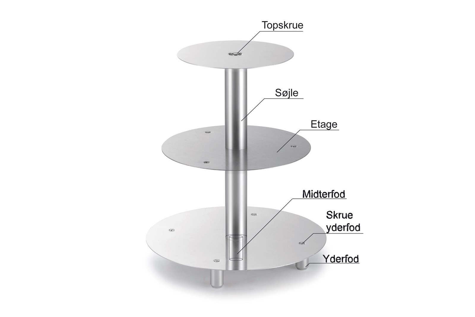 Her finder du diverse enkeltdele til den runde kageopsats i flere etager, der bruges til f.eks. bryllupskager.