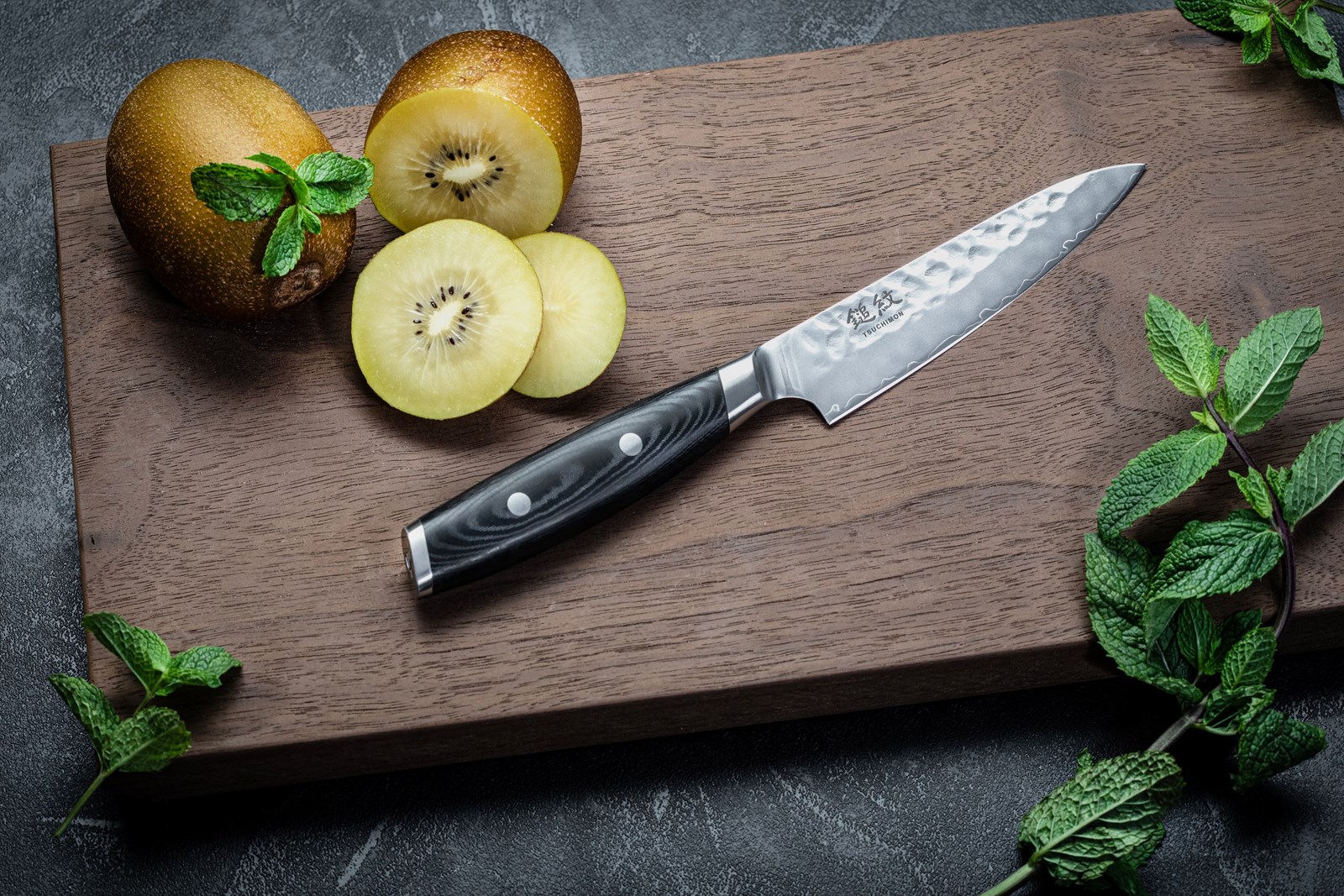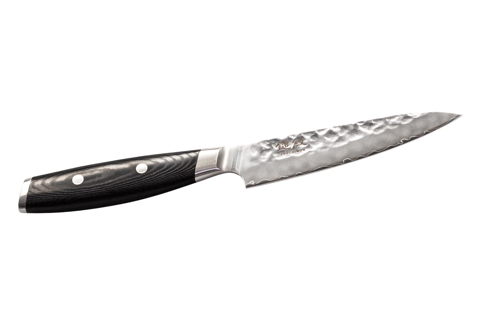 Japansk urtekniv og grøntkniv i Petty-stilarten med knivblad på 12 cm med hammermærker, samt skæfte af sort komposit.