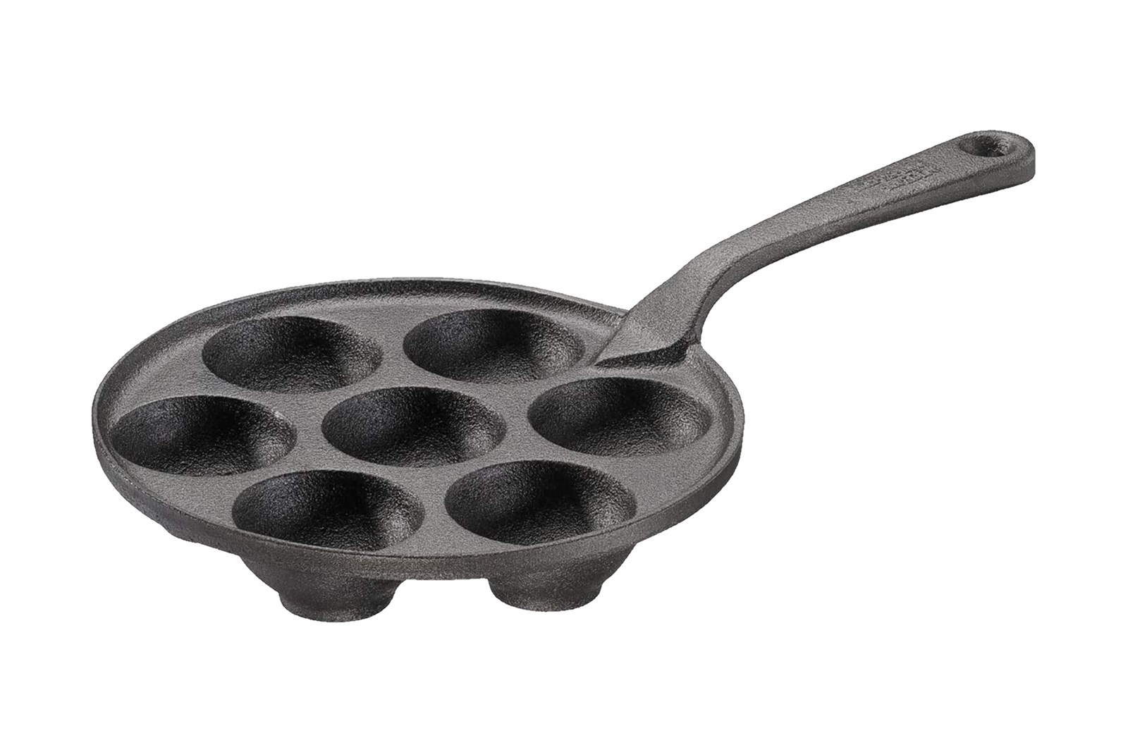 Æbleskivepande i uemaljeret støbejern med plads til 7 æbleskiver. Panden har støbejernshåndtag med hul til ophæng. Den tåler metalredskaber og alle komfurtyper, inkl. induktion.