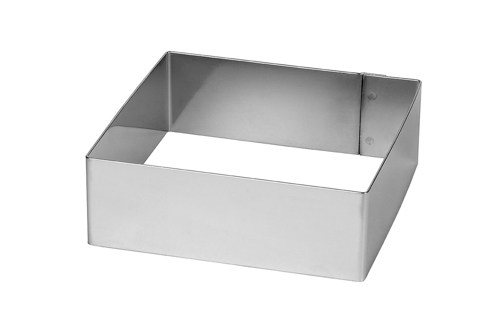 Kvadratisk bageramme i rustfrit stål uden bund til kager, lagkager, desserter og is. Fås i flere størrelser, alle med en højde på 4,5 cm.