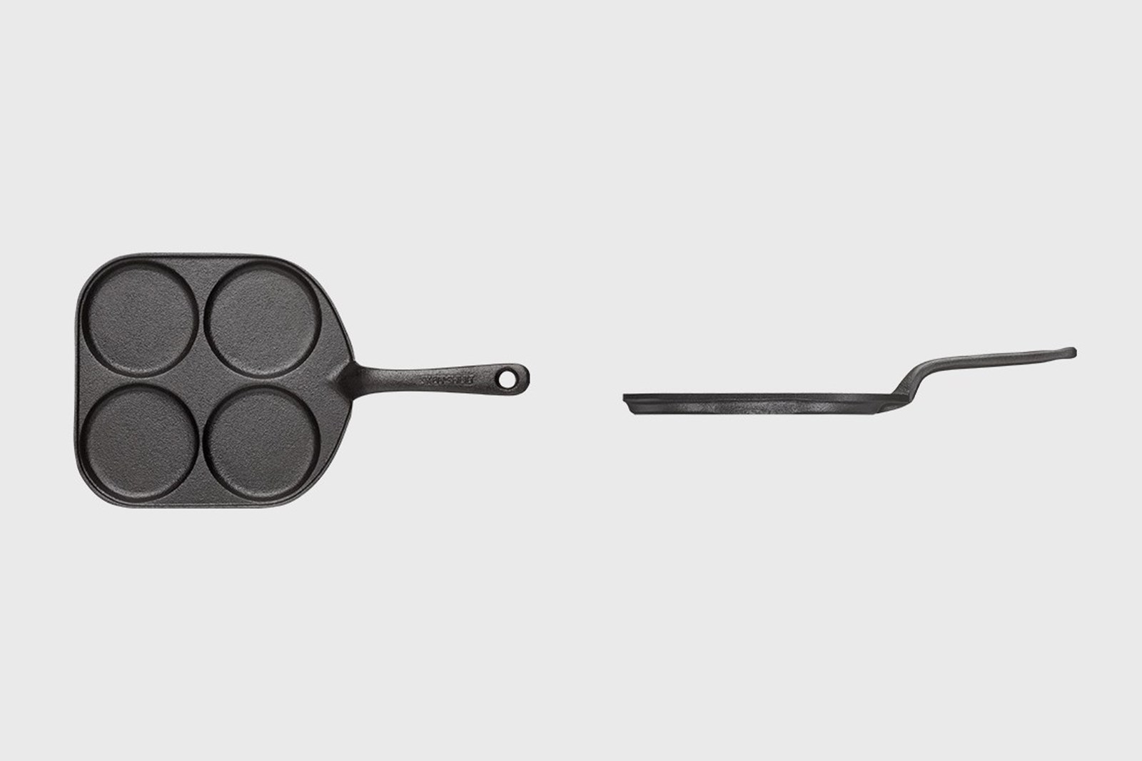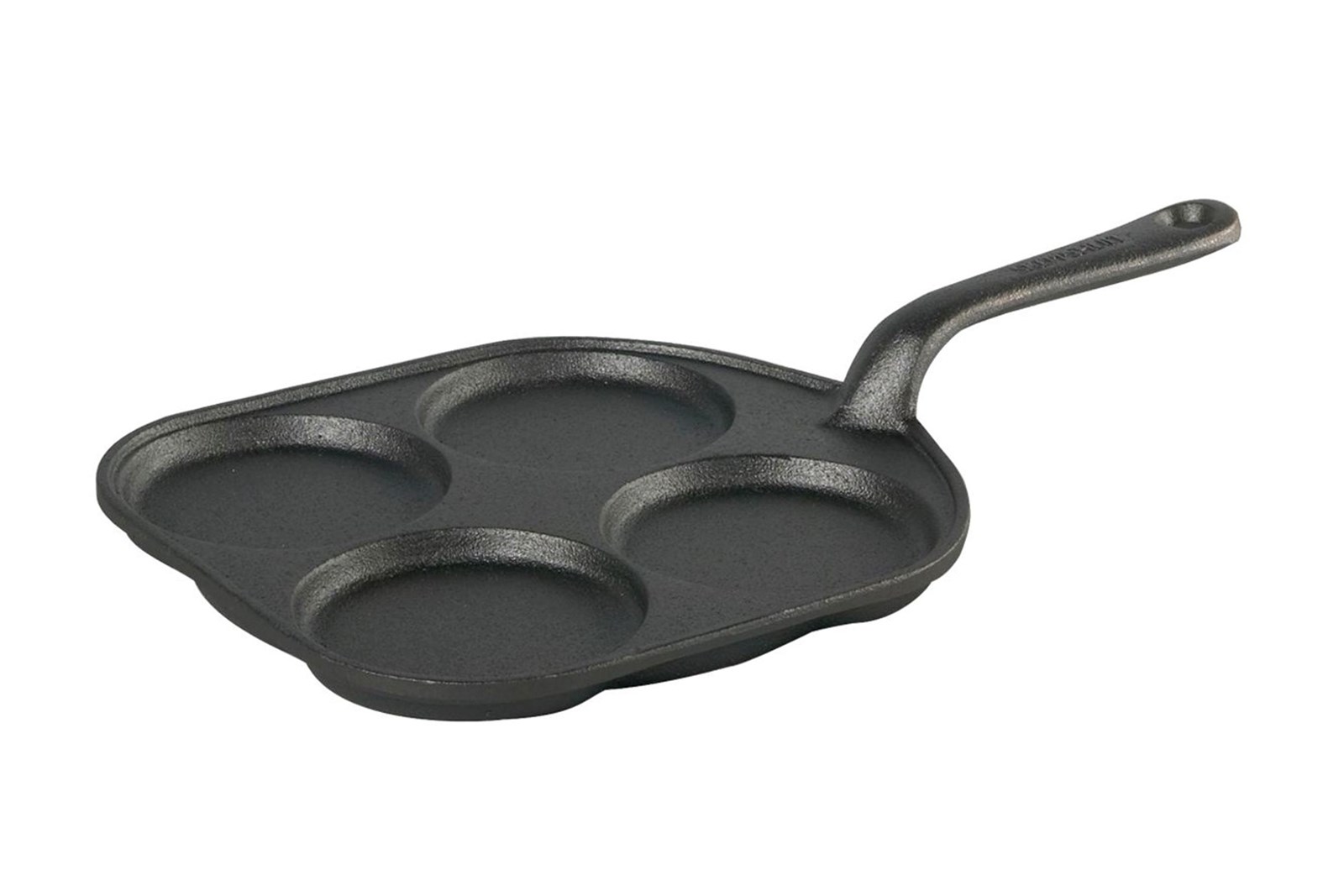 Panden har fire runde fordybninger til blinis, små pandekager eller spejlæg, hver med en diameter på 9 cm.