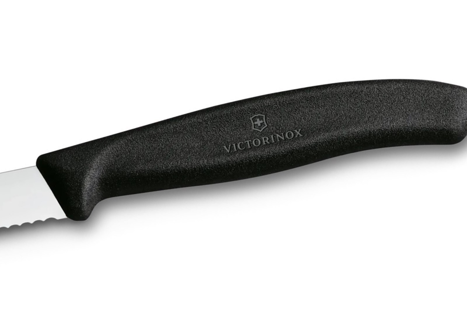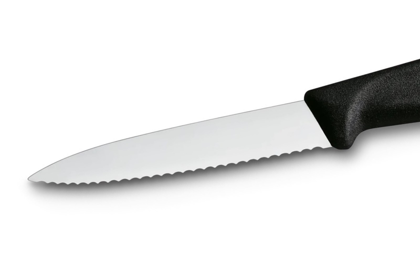 Lille kniv fra Victorinox med skarpt og buet bølgeskær på 8 cm og ergonomisk skæfte af sort plast.