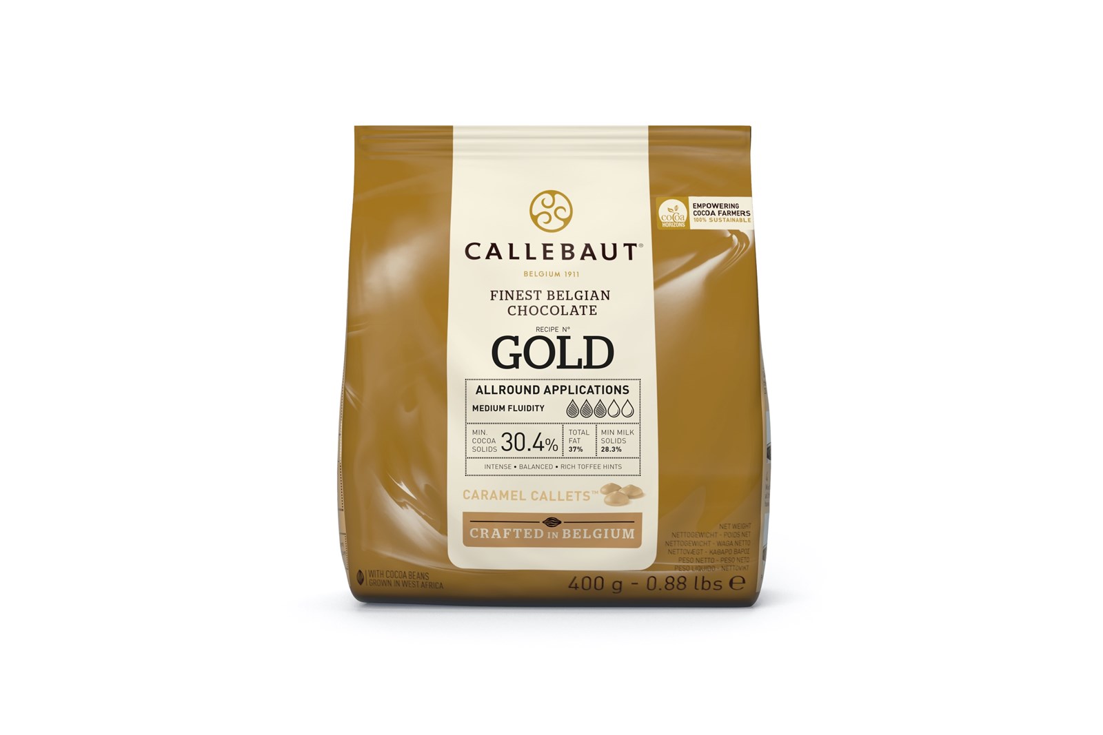 400 g mælkechokolade i perler, kendt som Recipe No. Gold, fra belgiske Callebaut. Chokoladen har en rund, karamelliseret smag med noter af toffee, smør, fløde og et let strejf af salt. Den gyldne nuance og bløde kakaokrop gør den nem at kombinere med mange forskellige smage og ingredienser.