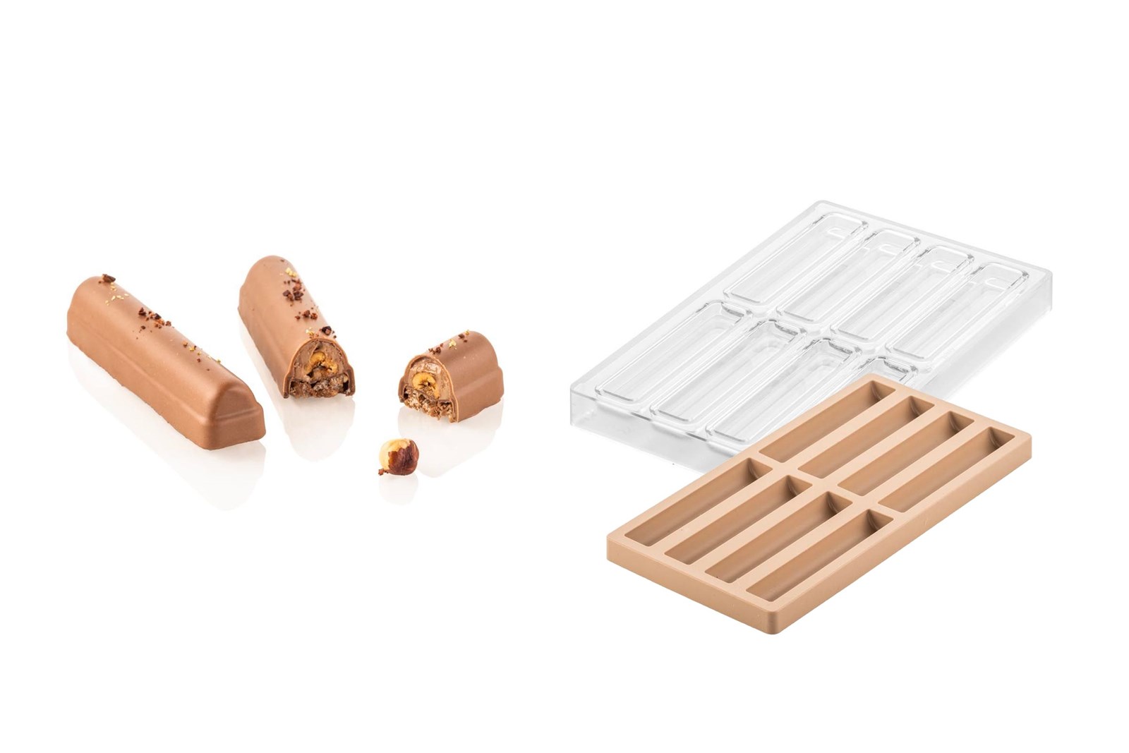 Kit Bar Volta er et sæt bestående af en chokoladeform i klar Tritan-plast og en silikoneform til indlæg i chokoladen. Med sættet kan du støbe 8 stk. glatte, aflange chokoladebarrer med indlæg/dobbeltfyld, så du f.eks. kan lave chokolader med fyld af ganache og frugtgelé inderst, eller hvad du nu har lyst til.