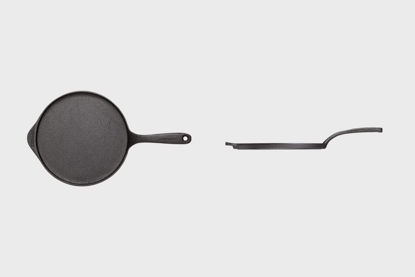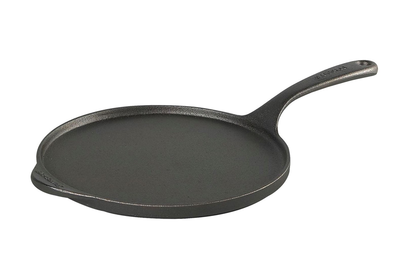 Rund støbejernspande med lav kant og støbejernshåndtag med hul til ophæng. Panden tåler metalredskaber og alle komfurtyper, inkl. induktion. Bemærk, at støbejernspander er tunge og derfor mindre egnede til at vende pandekager i luften.