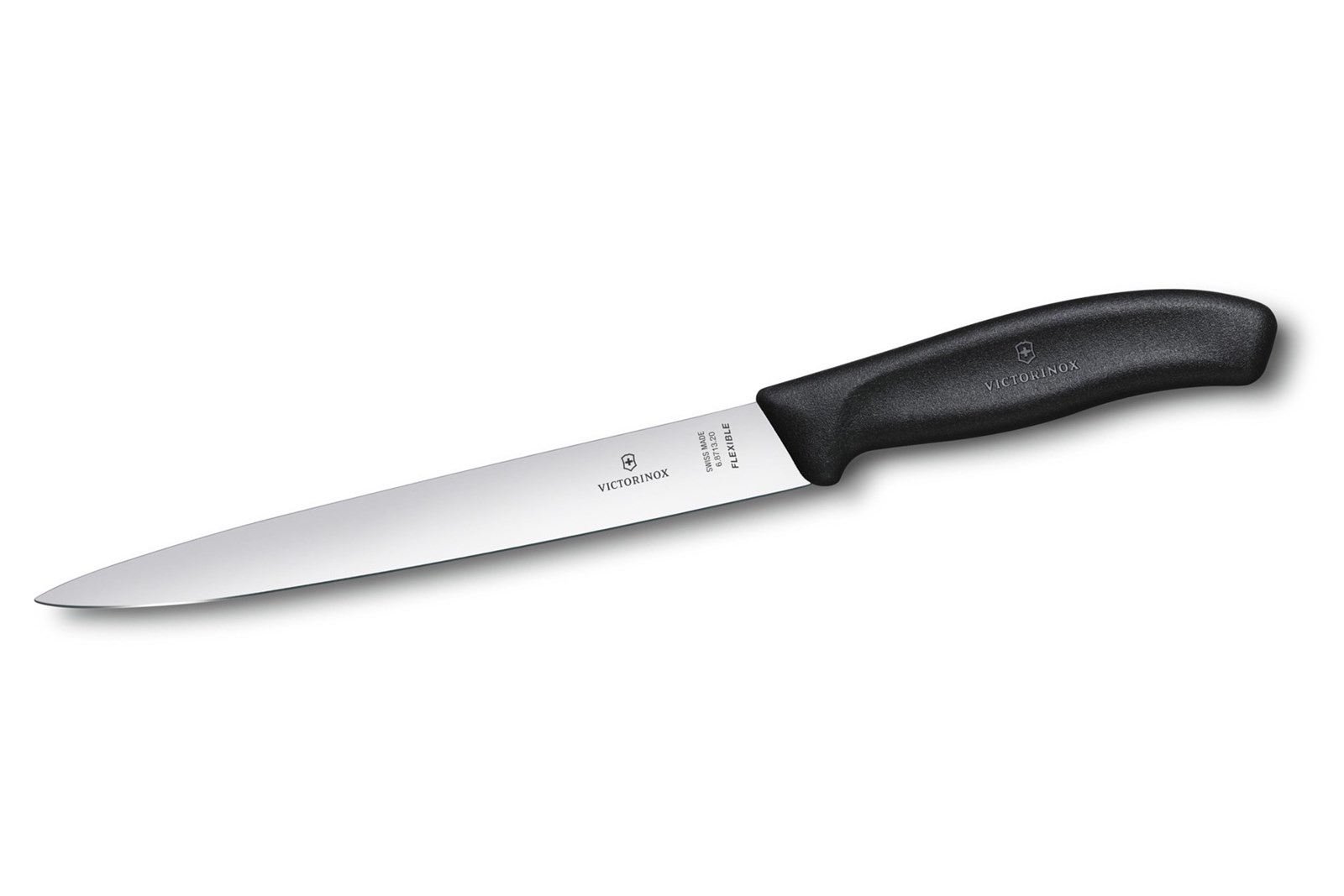 Let filetkniv med fleksibelt knivblad på ca. 20 cm af rustfrit stål og skæfte af sort Fibrox.