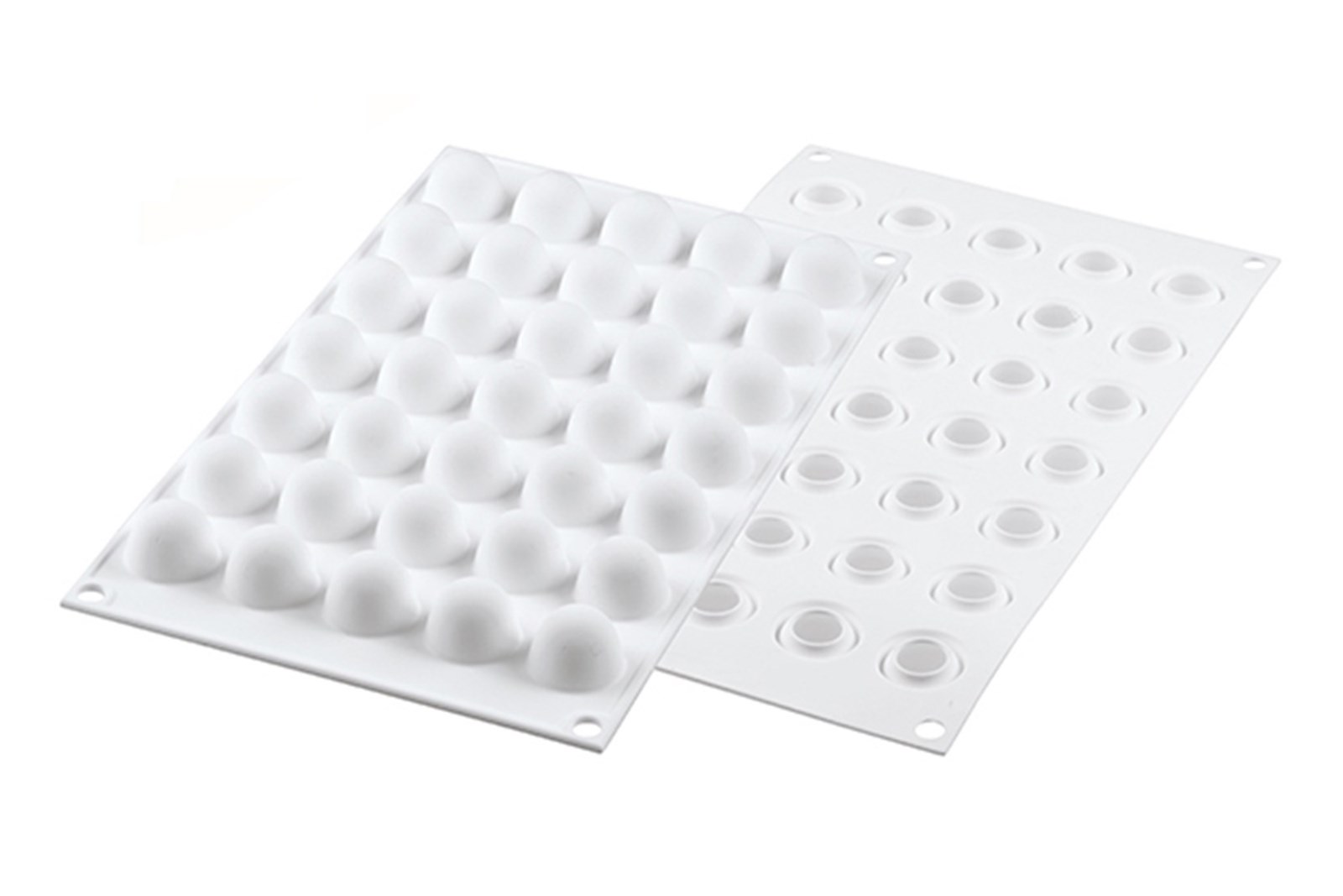 Silikoneformen Truffles 5 indeholder 35 små runde hulrum, og den er derfor velegnet til små desserter og kager, f.eks. trøffelkugler.