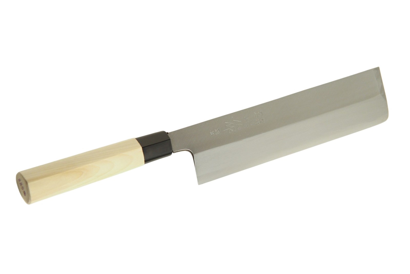 Japansk grøntkniv i Usuba-stil fra Masahiro med rektangulært knivblad af hårdt japansk 'Ki Gami' karbonstål (kulstofstål) samt skæfte af lyst magnolietræ.
