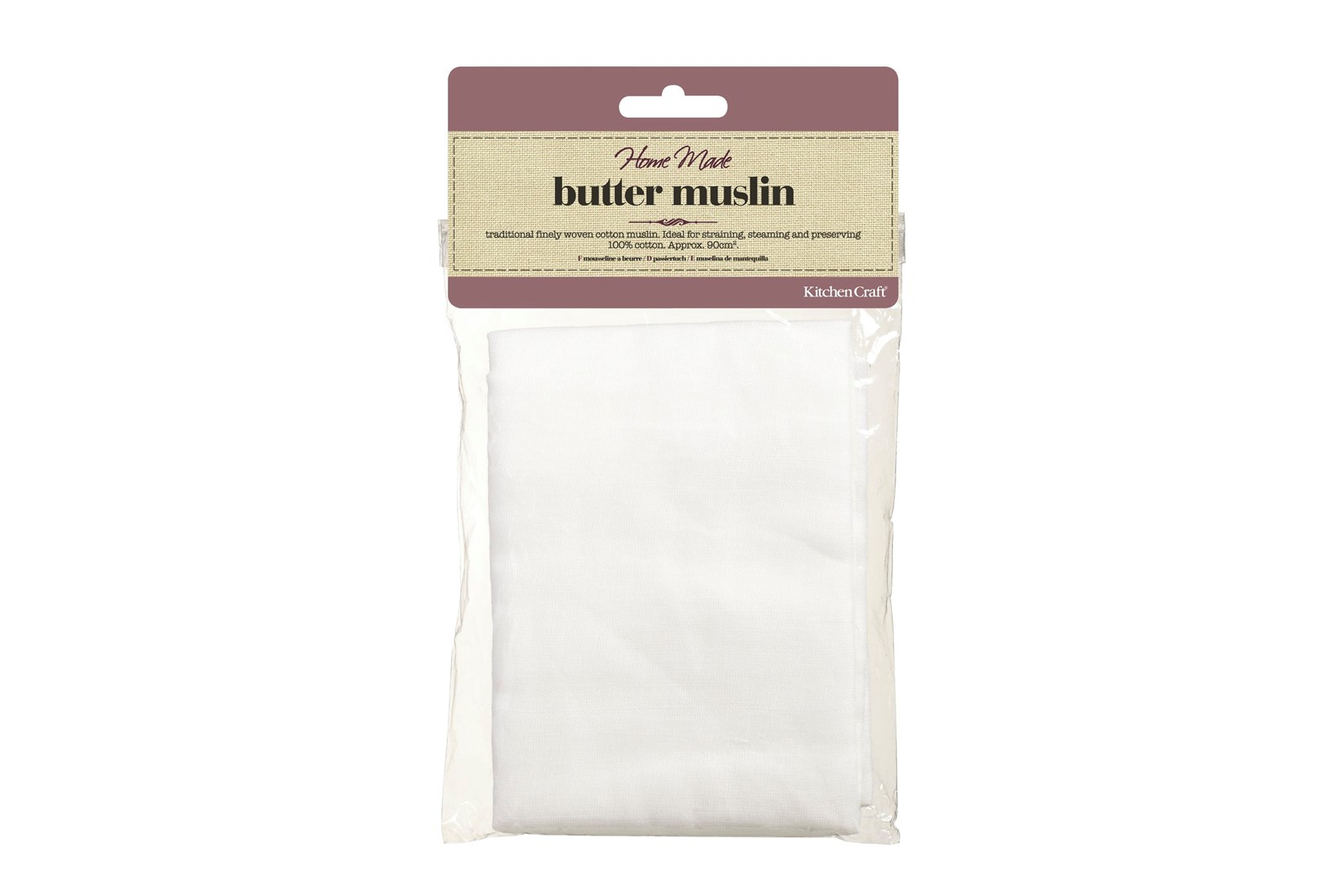 Fintvævet ostelærred på omtrent 90x90 cm. Det kan bruges til at si med, til marmelade og syltetøj, når man laver ost, damper fisk og grøntsager og som krydderipose. Lærredet kan også bruges i hævekurve, når man bager brød. Det skal vaskes i vaskemaskine inden første brug.