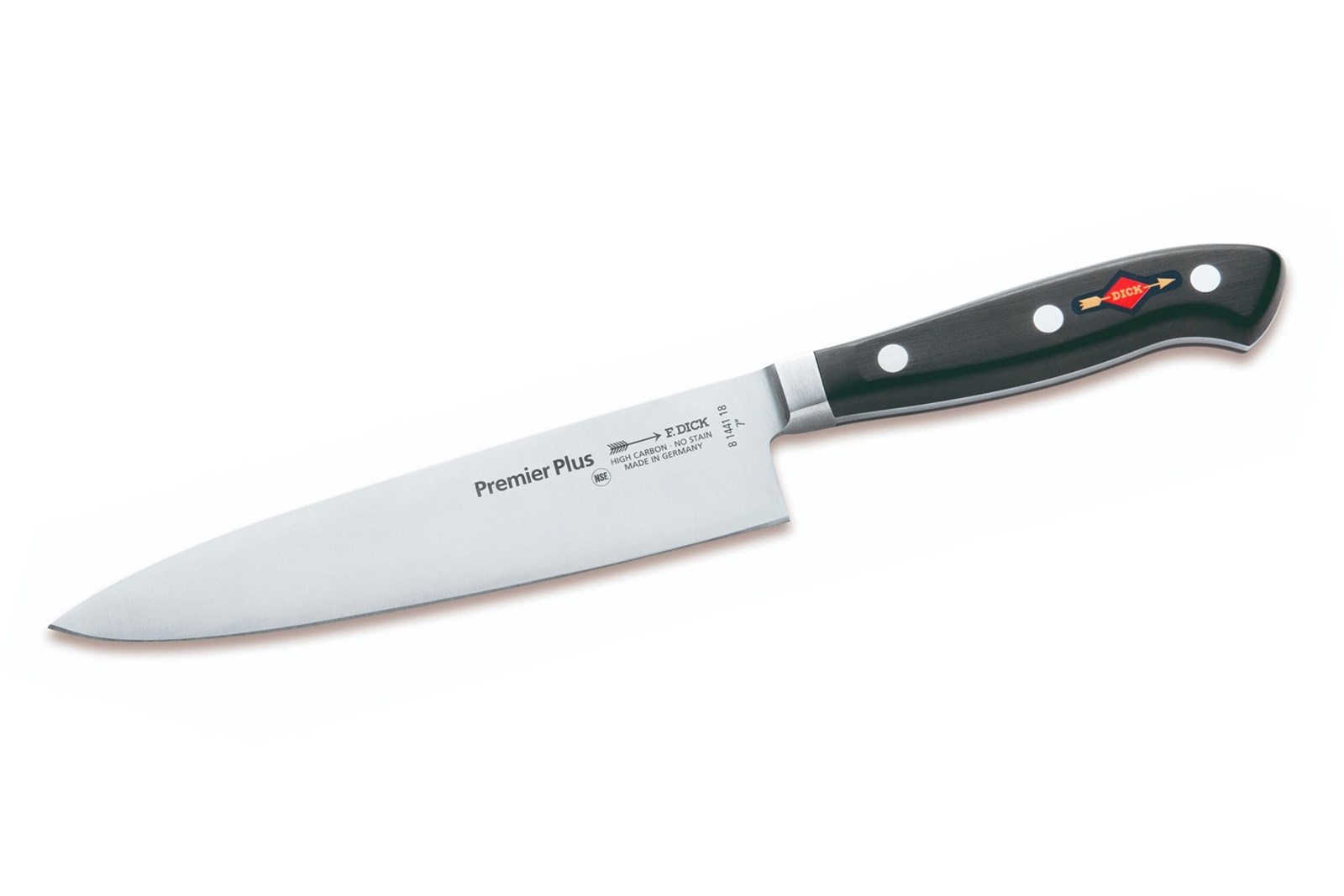 Kniven er fra F. Dicks Premier Plus Eurasia-serie, der kombinerer traditionelle japanske designprincipper med den velkendte kvalitet fra det tyske firma. Knivene i serien er fuldsmedede i hårdt og hærdet stål, der kan slibes meget skarpt, og med ergonomiske skæfter i sort POM-plast, der føles som træ i hånden.