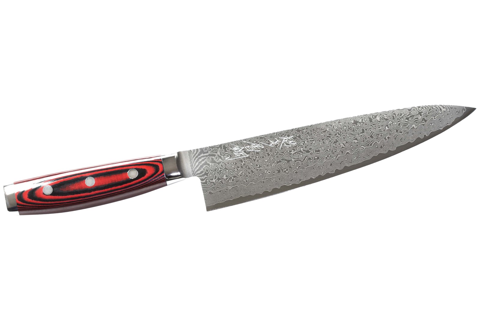 Japansk kokkekniv i Gyuto-stil med Damascus-knivblad på 25,5 cm af 161 lag pulverstål samt skæfte i rødt komposit.