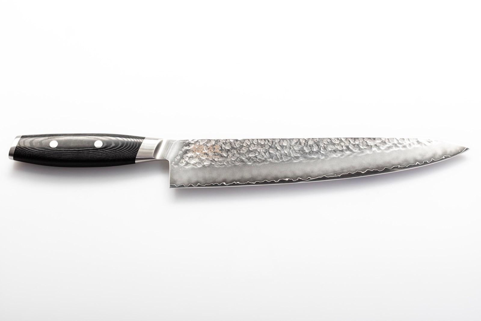 Japansk kokkekniv i Gyuto-stilarten med knivblad på 25 cm med hammermærker, samt skæfte af sort komposit.