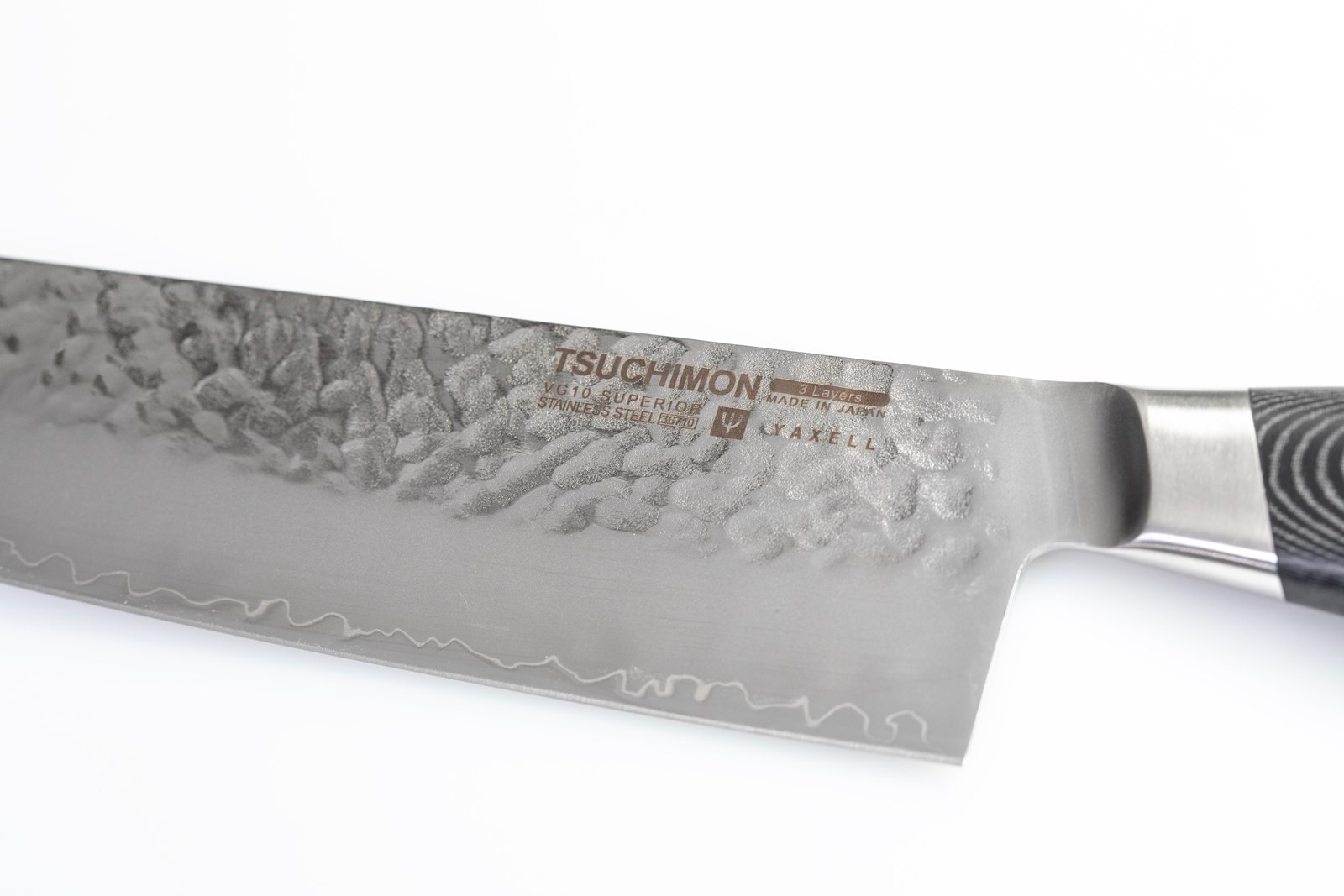 Knivene i Yaxell Tsuchimon-serien har en VG10 rustfri stålkerne, med en super hårdhed på 61 HRC på Rockwell-skalaen. Knivene i serien har tre lag stål med hammermærker på bladets ene side. Skæftet er fremstillet af sort Micarta, som består af bomuldsfibre og harpiks. Fordelen ved dette materiale er, at det giver et greb lige så godt som træ, men uden at blive påvirket af fugt og varme, som træ normalt gør.
