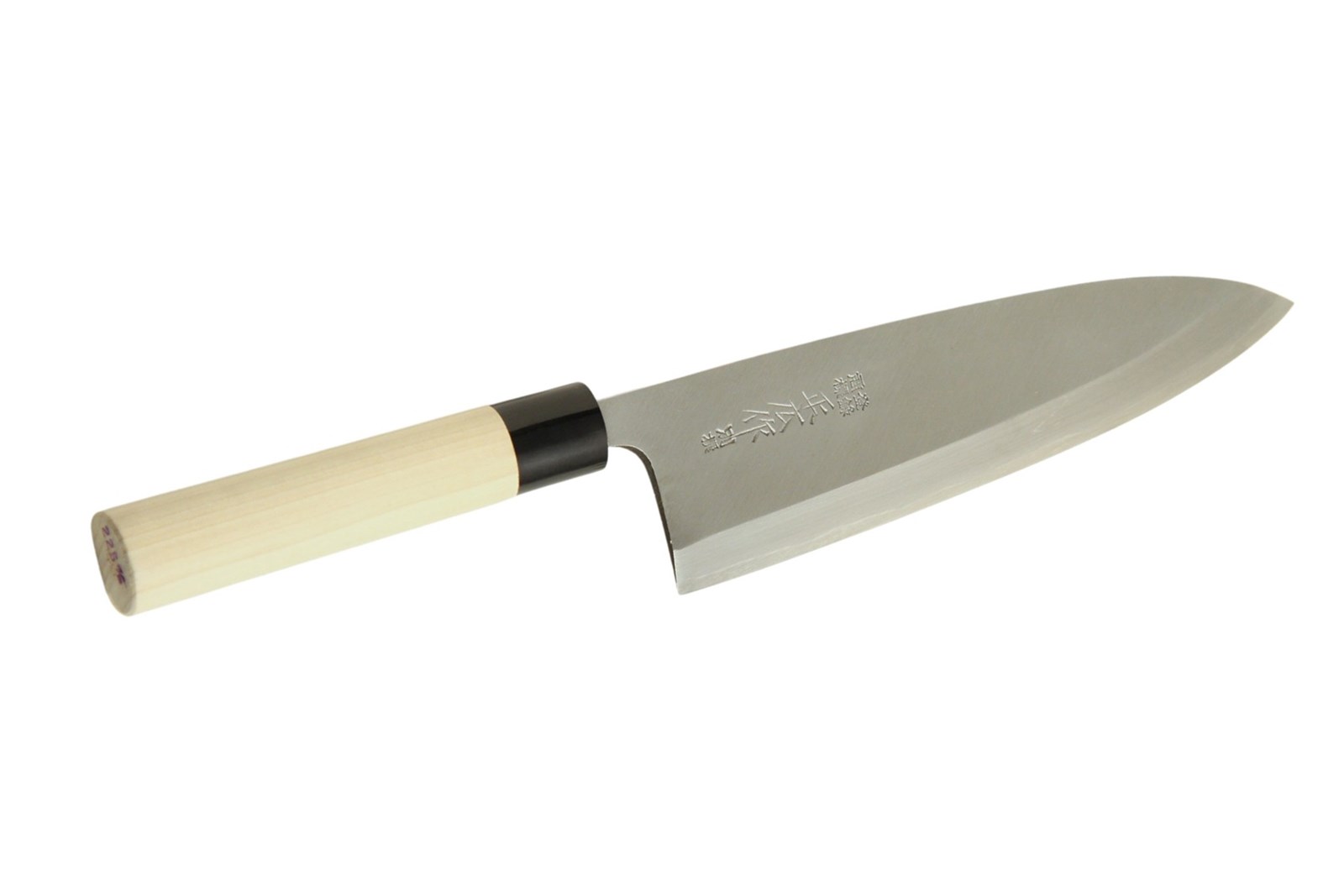 Traditionel og bred japansk kokkekniv i Deba-stilarten med knivblad af kulstofstål og skæfte af lyst magnolietræ.