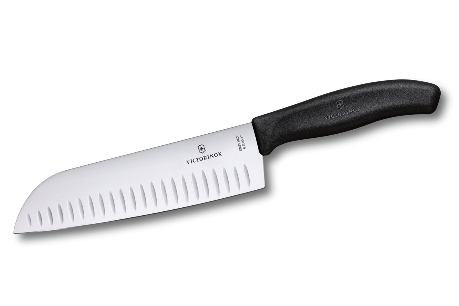 Let og alsidig kokkekniv/grøntkniv fra Victorinox i Santoku-stil, med 17 cm knivblad i rustfrit stål og skæfte af sort Fibrox.