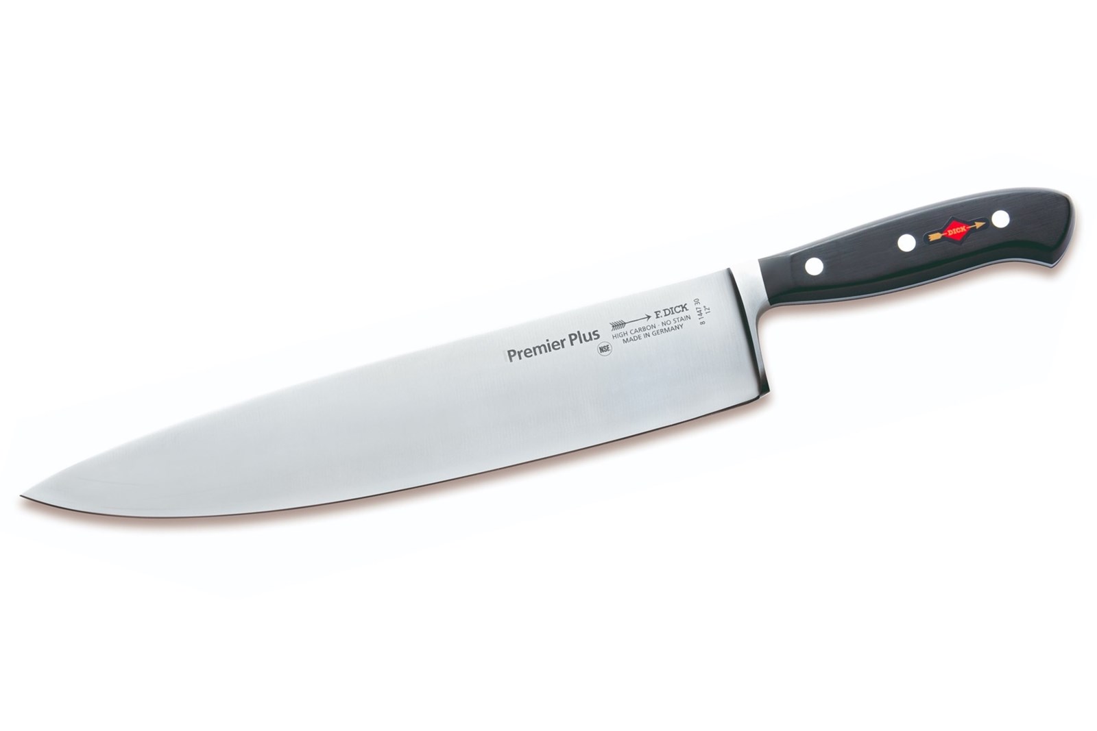 Knivene i Premier Plus-serien fra tyske F. Dick er fuldsmedede i hårdt og hærdet stål, der kan slibes meget skarpt, og med ergonomiske skæfter i sort kunststof, der føles som træ i hånden.