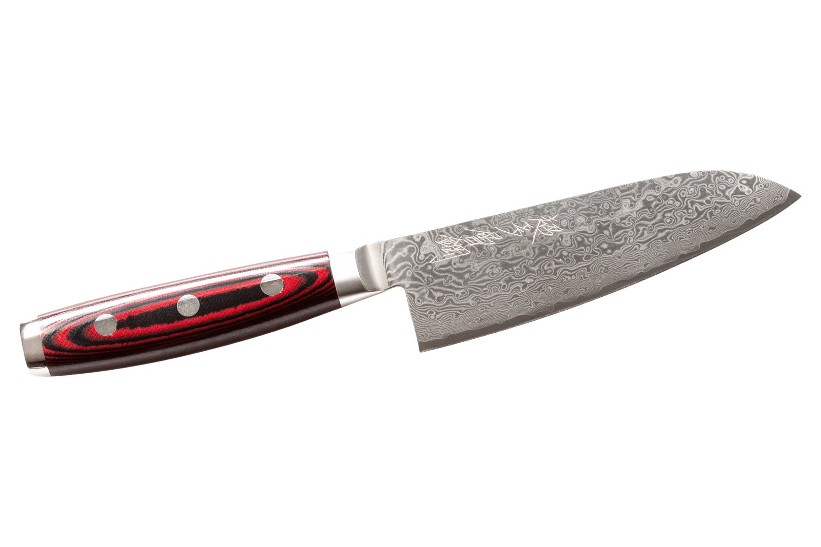 Japansk kokkekniv og grøntsagskniv i Santoku-stil med knivblad på 12,5 cm af 161 lag pulverstål, samt skæfte i rødt komposit.