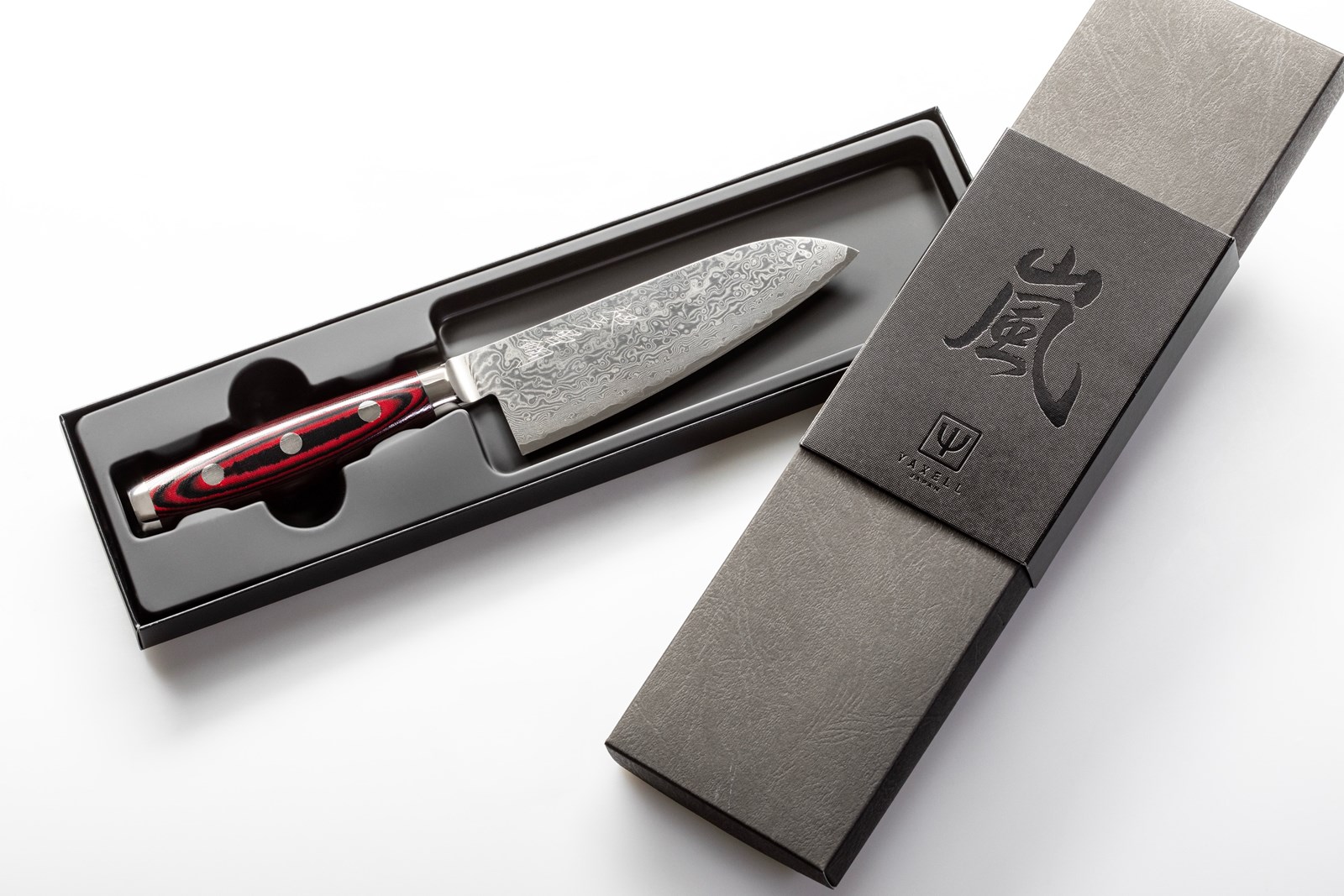 Knivene i Super Gou-serien fra Yaxell er udstyret med en kerne af SG2 Micro-Carbid rustfrit pulverstål, der har en imponerende hårdhed på 63 HRC på Rockwell-skalaen. Knivene har 161 lag stål med smukt Damascus-mønster og det japanske navn indgraveret både på bladet og på knivens endekappe. Serien har et elegant rødt Micarta-håndtag som er fæstnet med tre nitter.