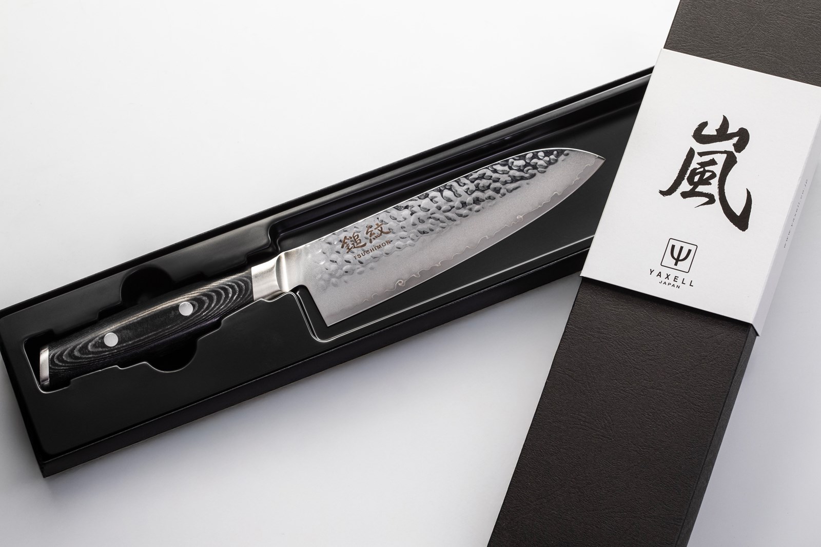Japansk kokkekniv og grøntkniv i Santoku-stilarten med knivblad på 16,5 cm med hammermærker, samt skæfte af sort komposit.