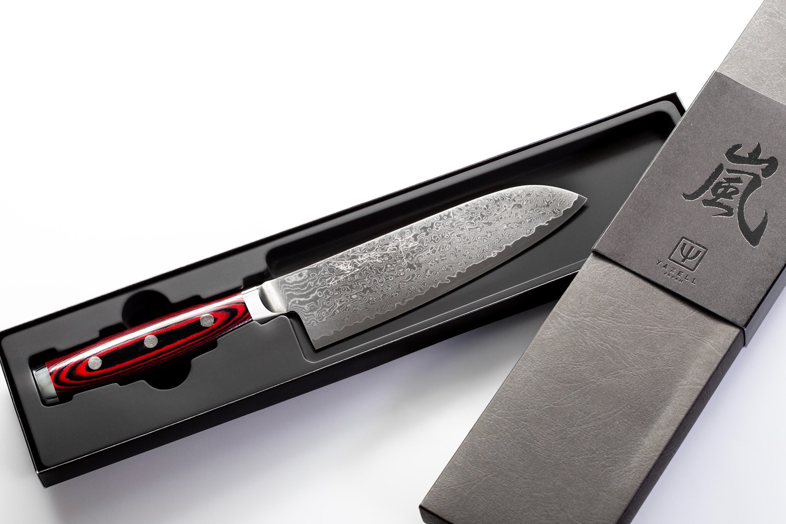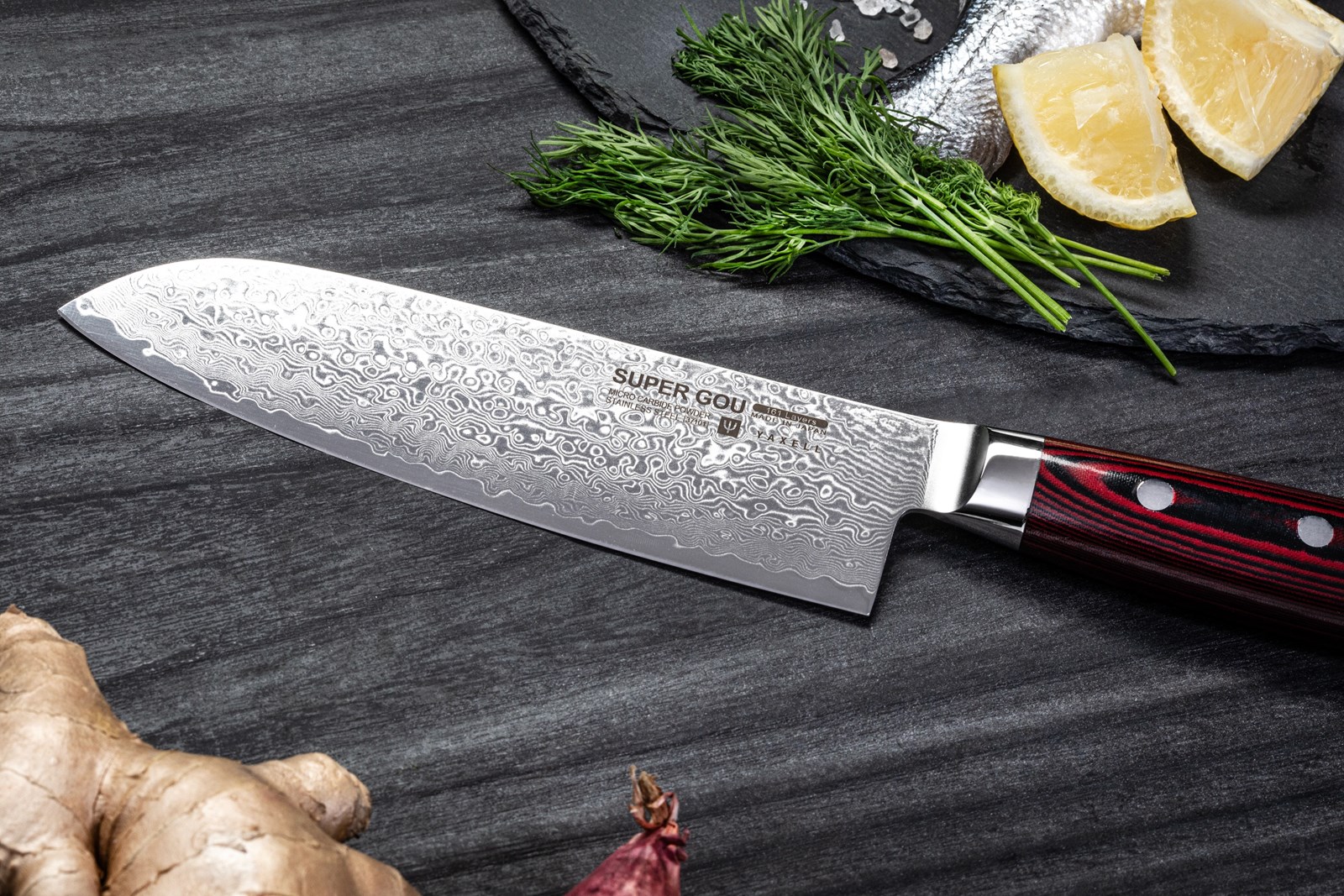Knivene i Super Gou-serien fra Yaxell er udstyret med en kerne af SG2 Micro-Carbid rustfrit pulverstål, der har en imponerende hårdhed på 63 HRC på Rockwell-skalaen. Knivene har 161 lag stål med smukt Damascus-mønster og det japanske navn indgraveret både på bladet og på knivens endekappe. Serien har et elegant rødt Micarta-håndtag som er fæstnet med tre nitter.