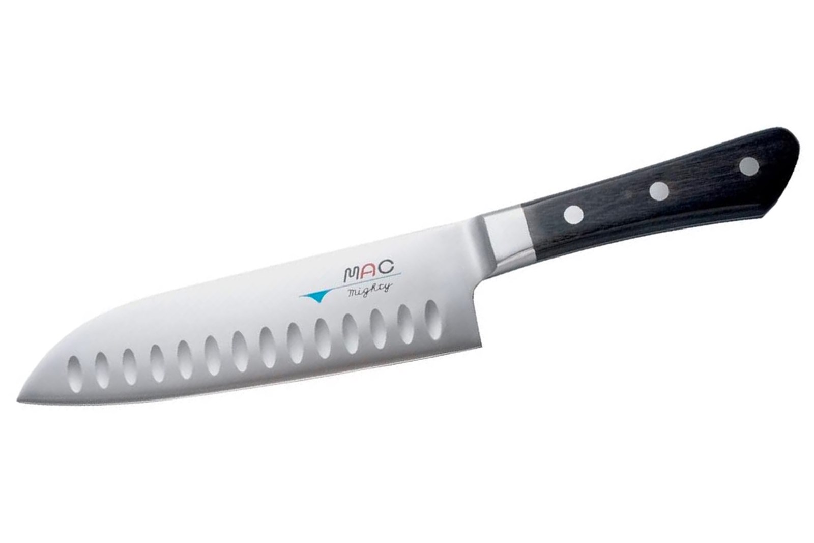 Kokkekniv/grøntkniv i Santoku-stil fra japanske MAC, med 17 cm langt knivblad af rustfrit stål og skæfte af sort pakkatræ.