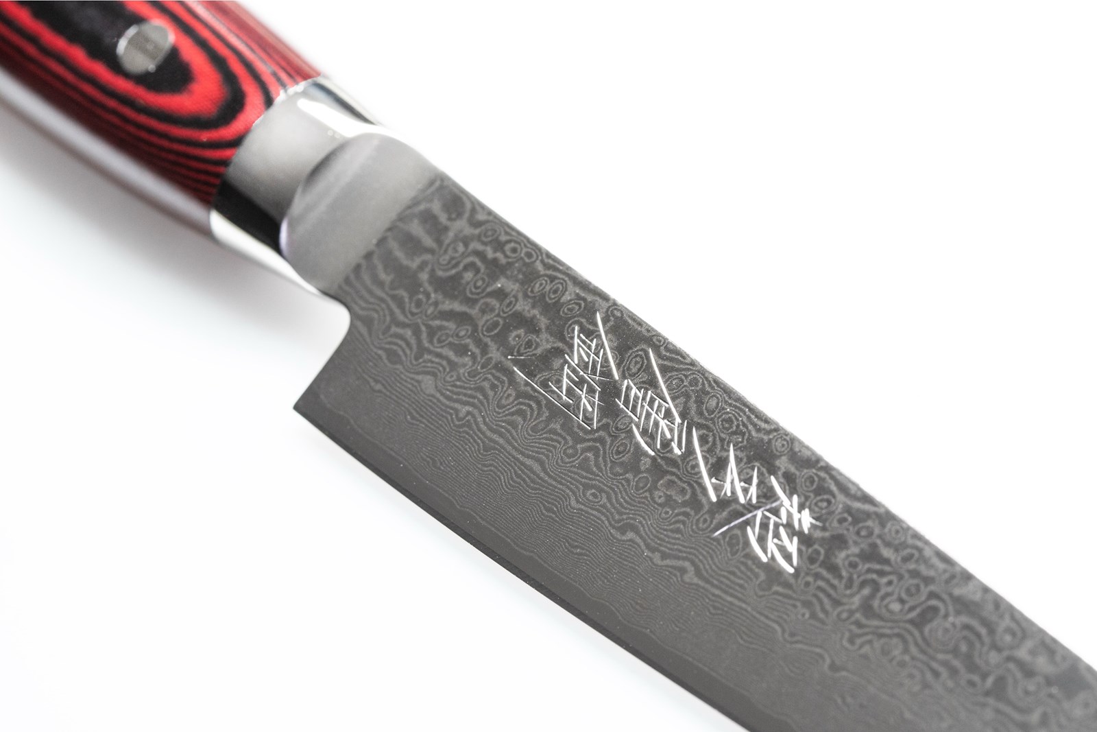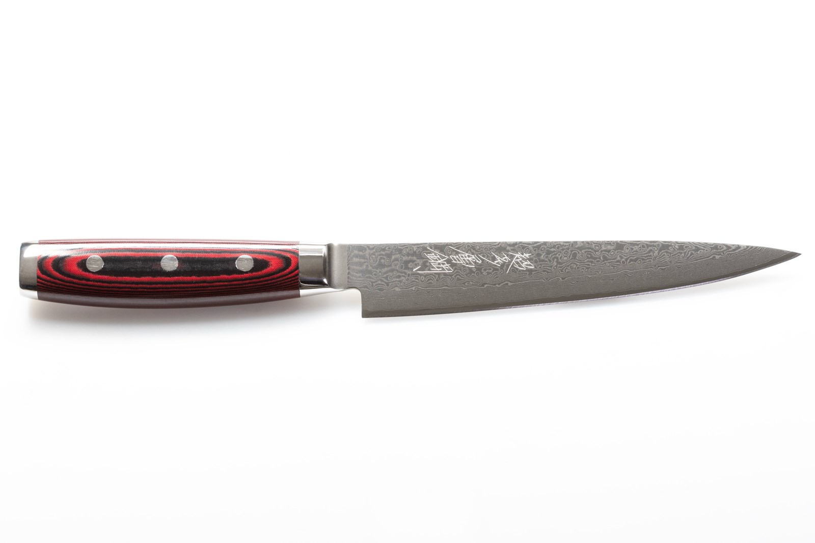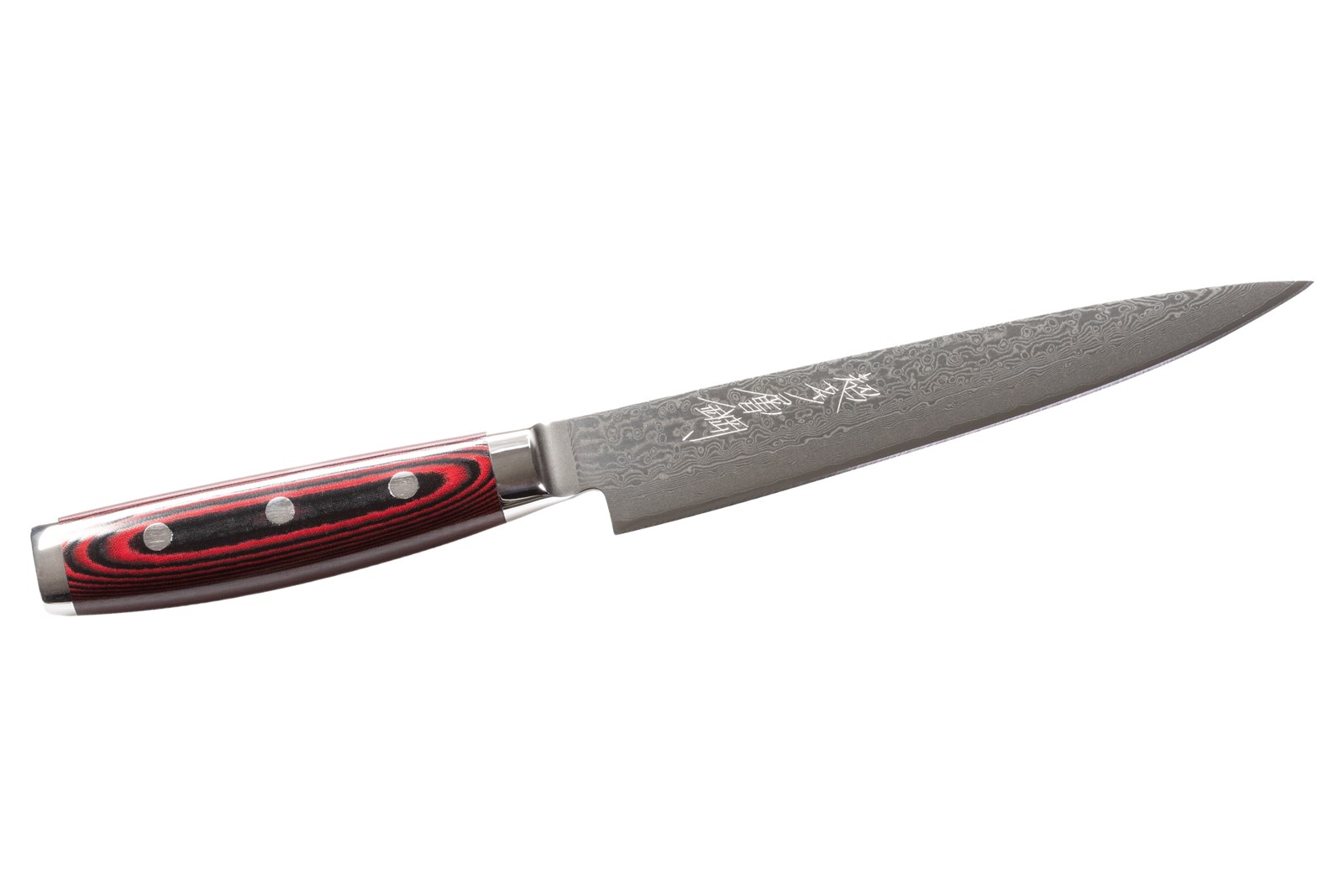 Japansk kokkekniv/trancherkniv med knivblad på 18 cm af 161 lag pulverstål, samt skæfte i rødt komposit.
