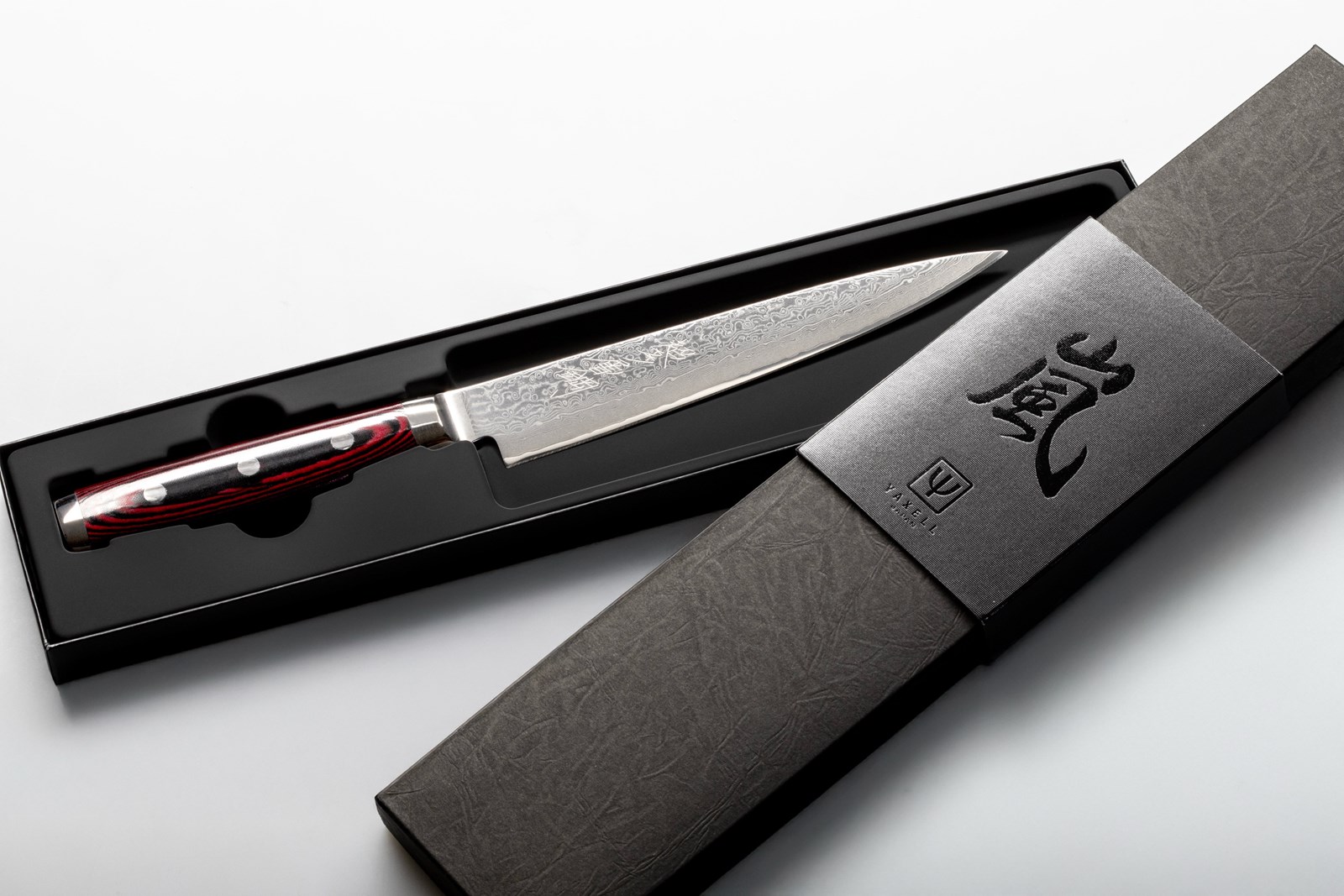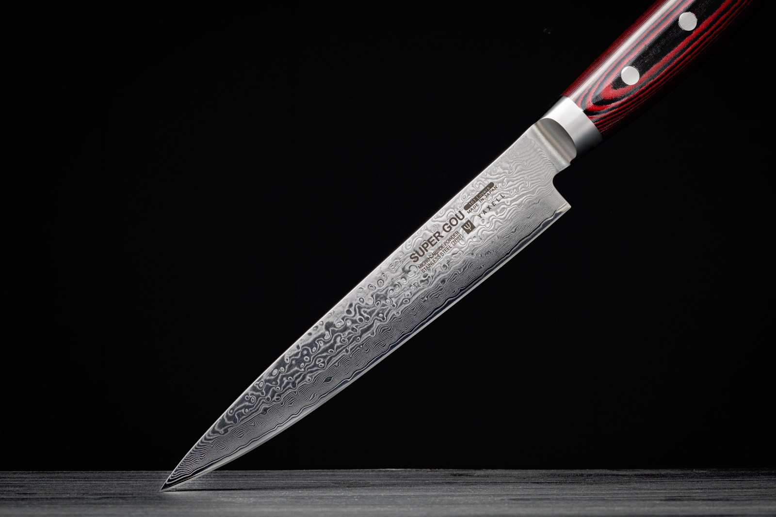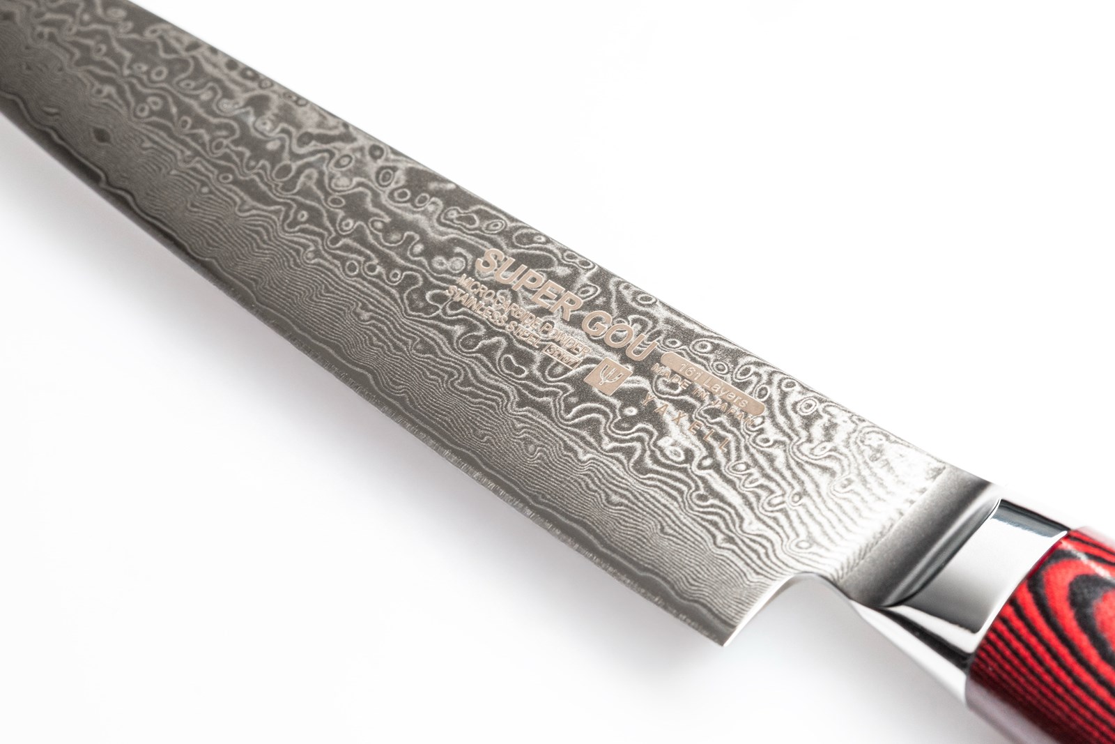 Knivene i Super Gou-serien fra Yaxell er udstyret med en kerne af SG2 Micro-Carbid rustfrit pulverstål, der har en imponerende hårdhed på 63 HRC på Rockwell-skalaen. Knivene har 161 lag stål med smukt Damascus-mønster og det japanske navn indgraveret både på bladet og på knivens endekappe. Serien har et elegant rødt Micarta-håndtag som er fæstnet med tre nitter.