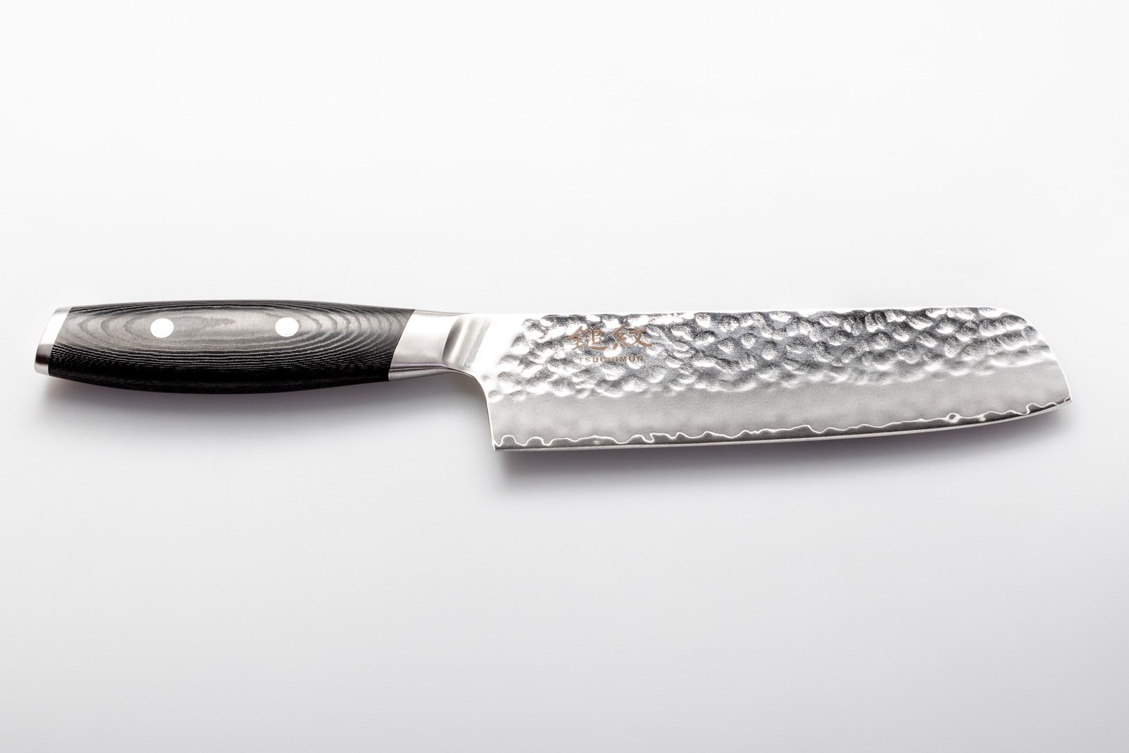 Japansk grøntkniv i Nakiri-stilart med rektangulært knivblad på 18 cm med hammermærker, samt skæfte af sort komposit.