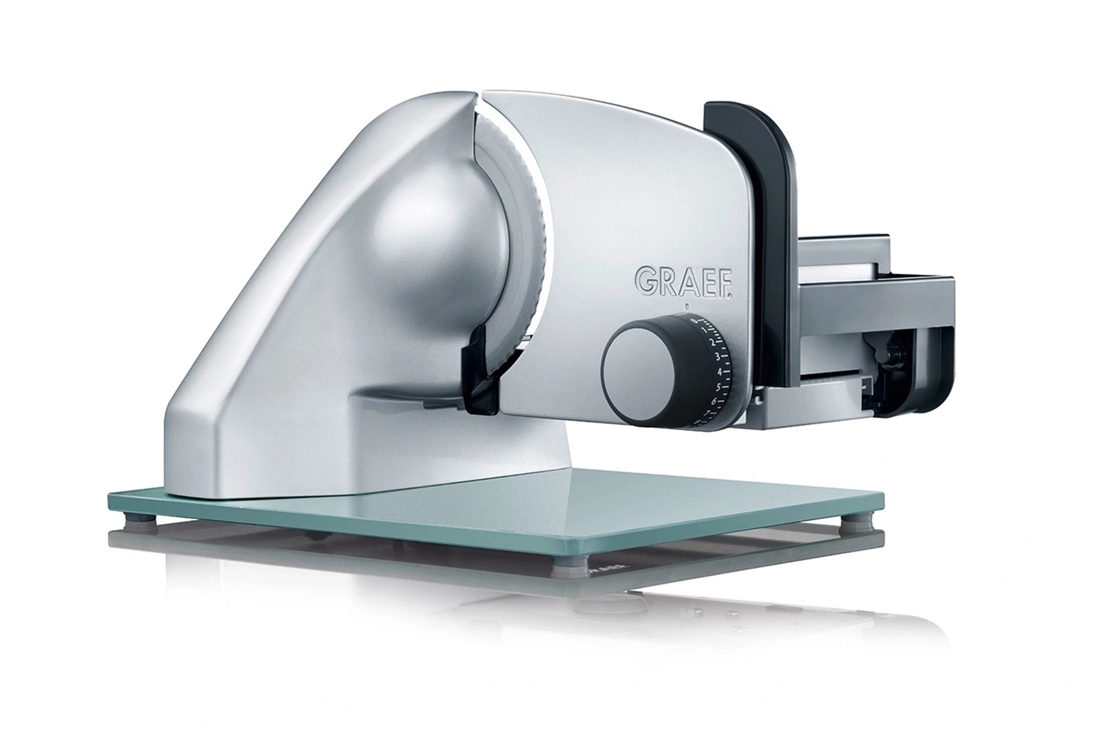 Slæden glider let på kuglelejer, og har plads til en steg eller et brød der måler maks. 22 cm i længden og 14 cm i højden. En restholder sørger for, at du kan udnytte hele emnet uden større risiko for fingrene – men pas alligevel på. Bundpladen af tykt glas er udstyret med sugekopper, så maskinen står stabilt under brug.