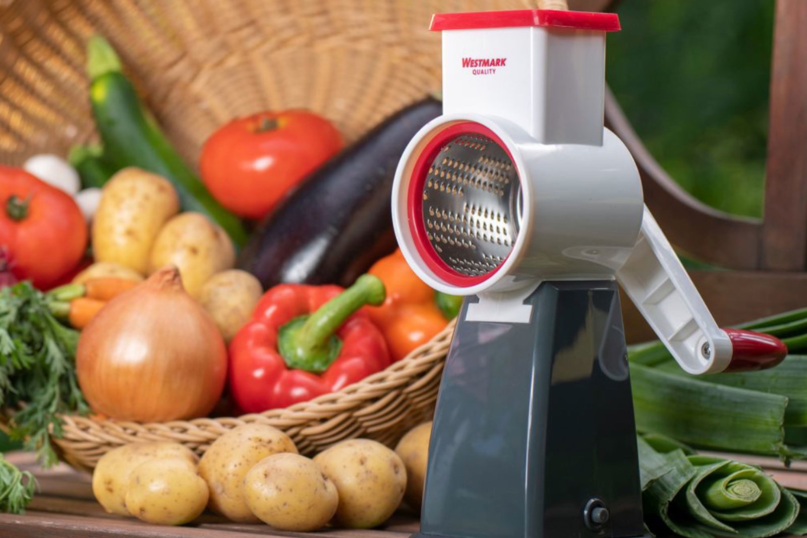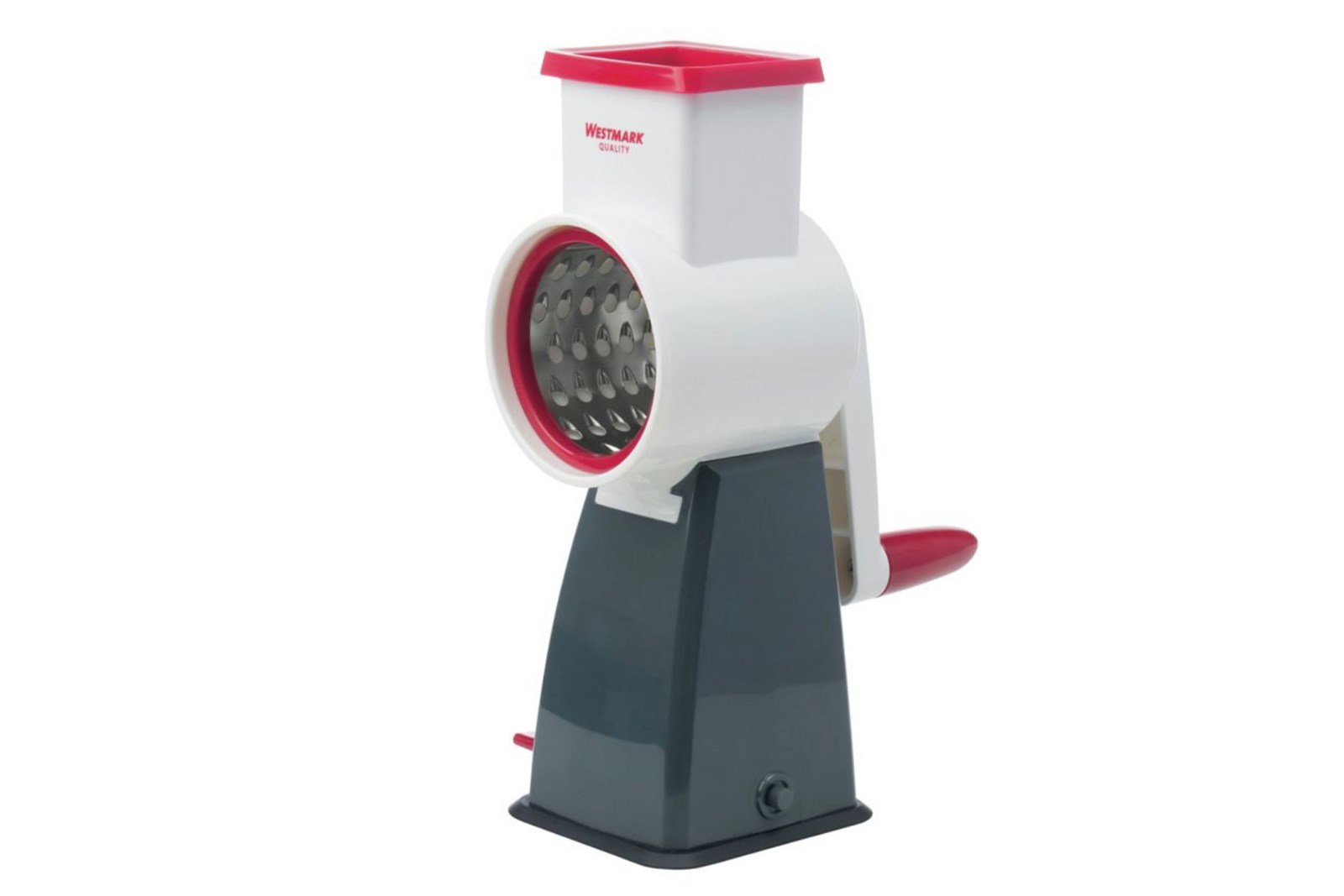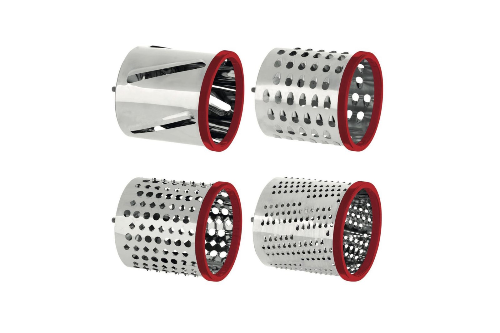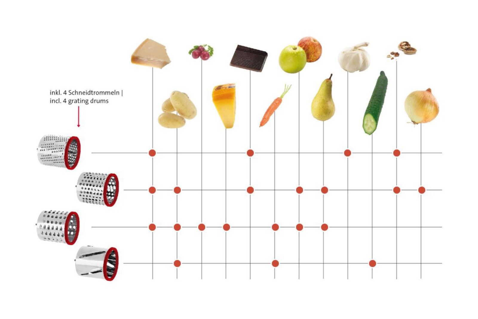 Materiale og konstruktion: Fremstillet i plast med rivejern i rustfrit stål. Leveres med 4 forskellige tromler, som nemt kan udskiftes efter behov. Konstruktionen beskytter fingrene under brug, og sugekop i bunden sikrer stabil placering på køkkenbordet. Maskinen kan skilles ad for rengøring.