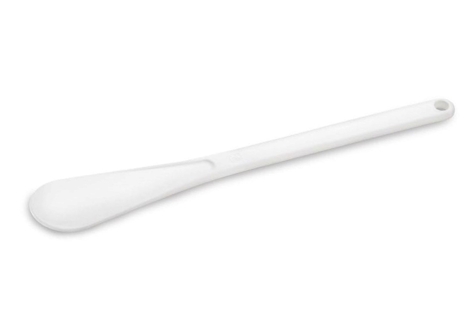 Praktisk og solid rørespatel til madlavning og bagning, fremstillet af hvidt glasfiber-forstærket plast med et hul i skaftet, så den kan hænge på en krog. Den tåler kortvarigt op til 200 °C.