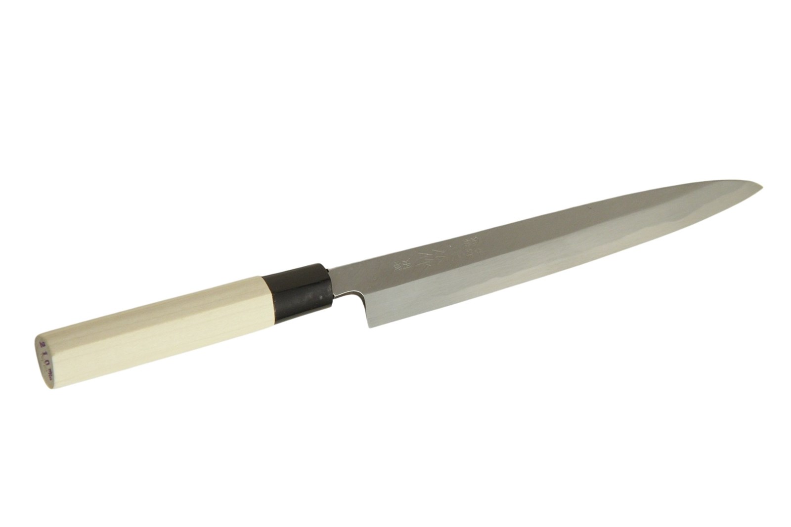 Denne Yanagiba fra Masahiro er fremstillet af japansk Ki Gami-stål (kulstofstål), med skæfte i klassisk stil af magnolietræ. Skæftet har et særligt langsgående fremspring, der skal forhindre hånden i at glide.