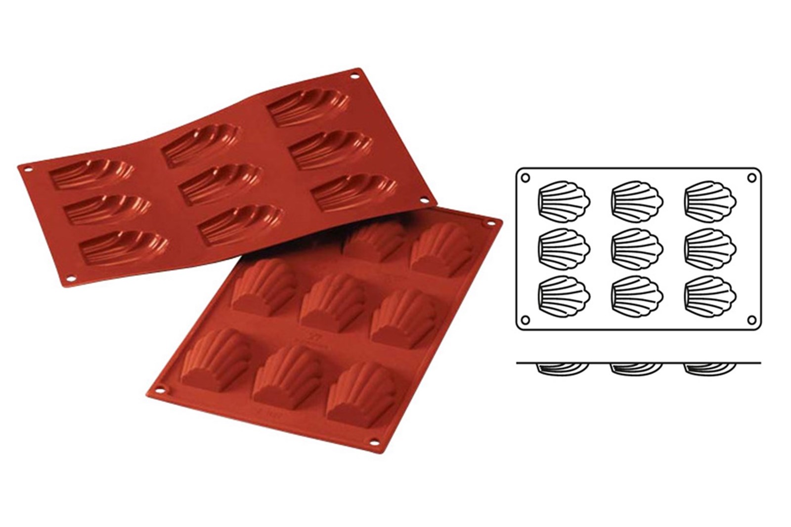 Silikoneformen her indeholder 9 hulrum til madeleines.