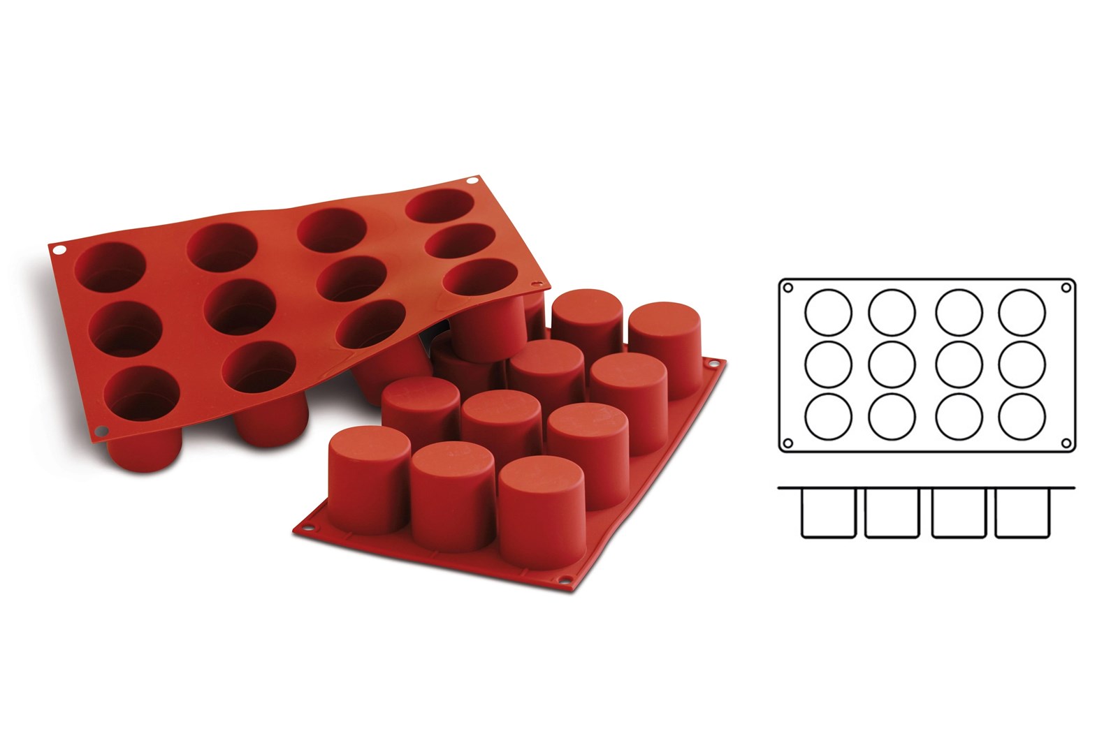 Silikoneform SF098 fra Silikomart med 12 små cylinderformede fordybninger til is, dessert og kage.