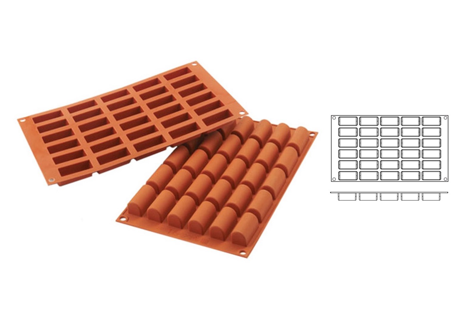 Silikoneformen SF129 indeholder 30 små, rektangulære hulrum med rundet bund til små, aflange desserter og kager.