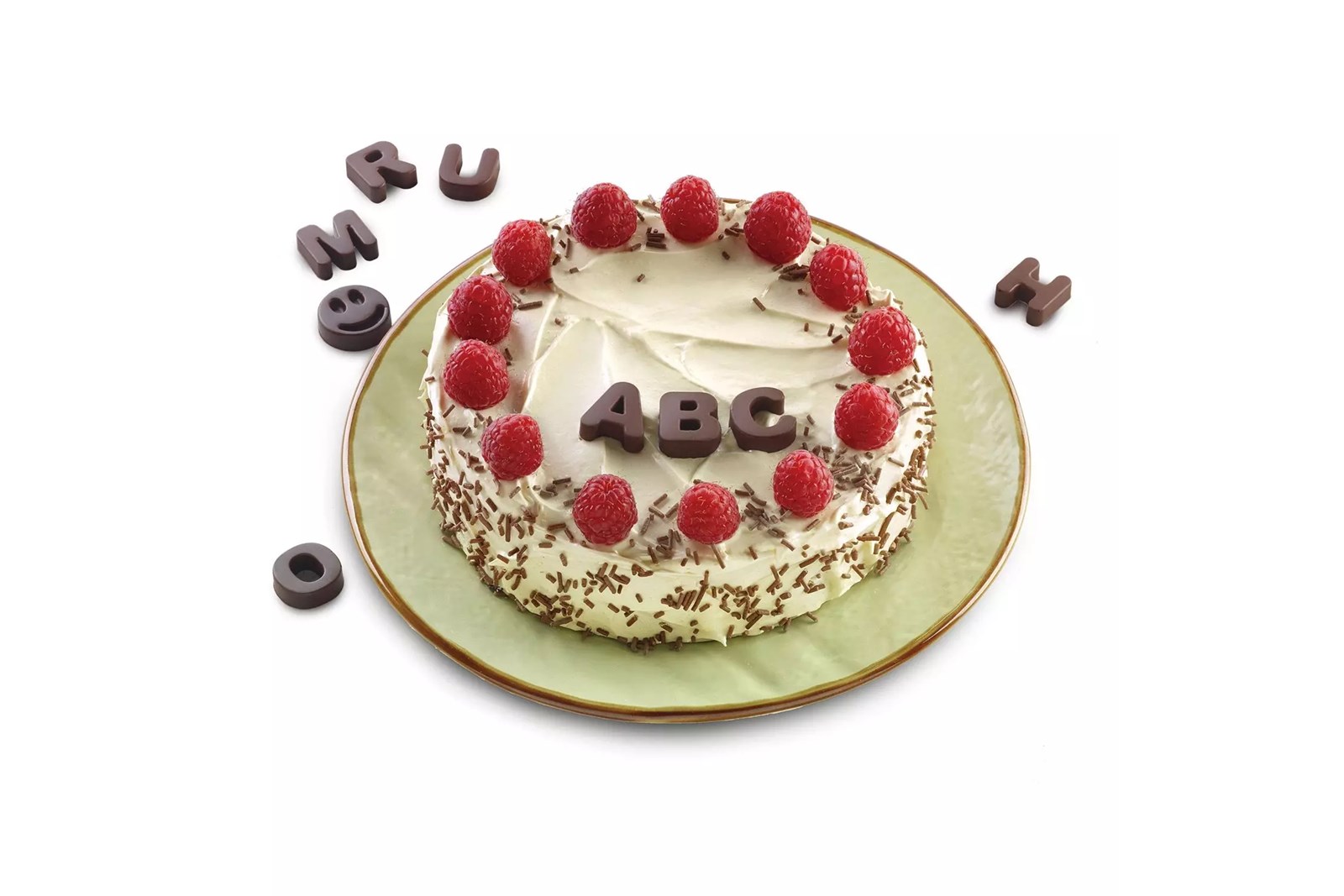 Silikoneform SF169 med bogstaver og tegn til diverse dekoration til kage, is og dessert.