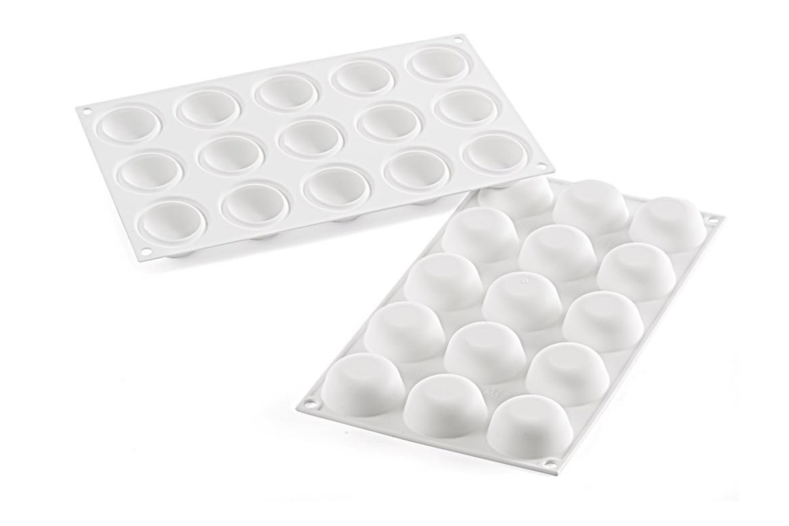 Silikoneformen Globe 26 indeholder 15 runde hulrum til små desserter og kager, petits four og "mignon pastries".