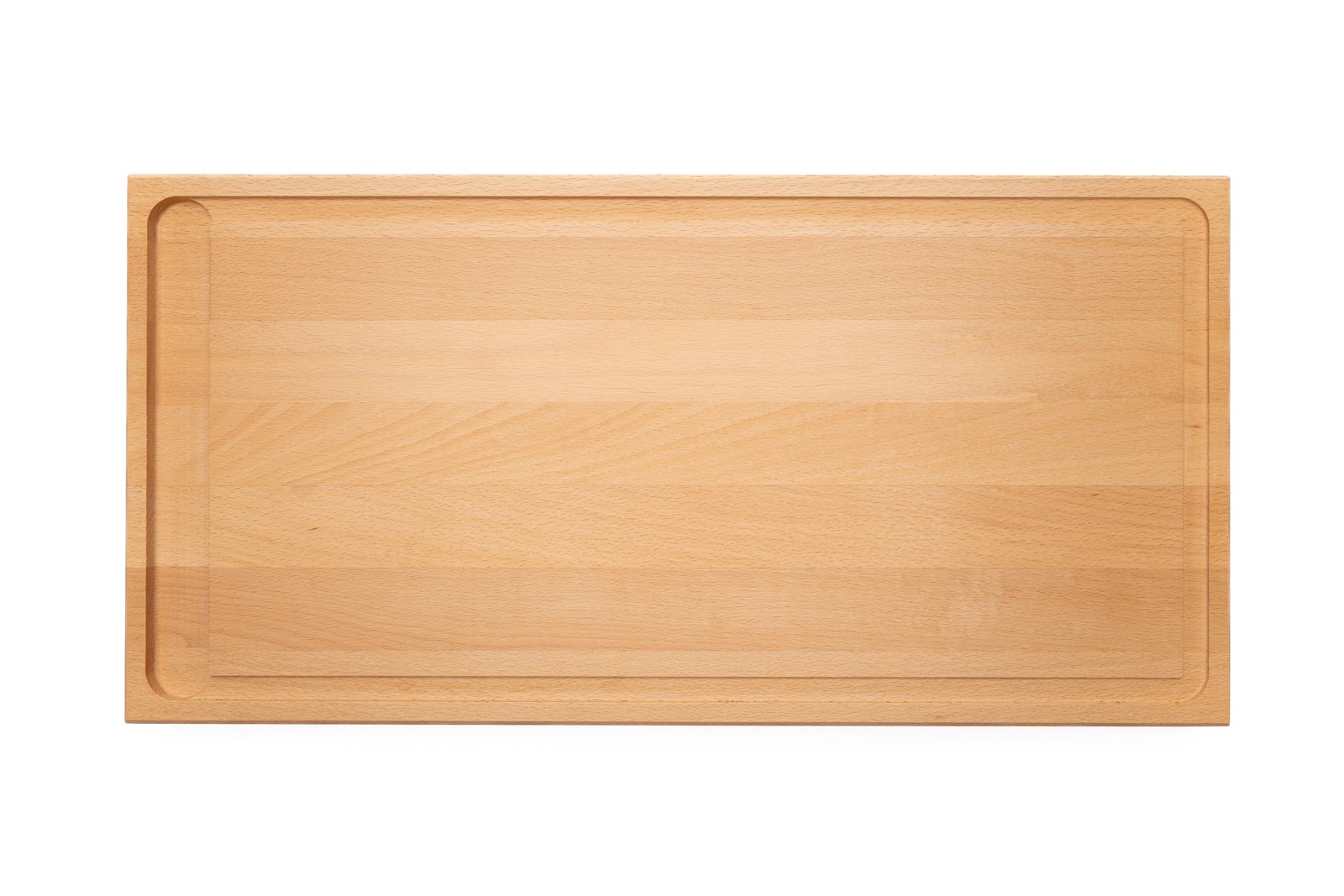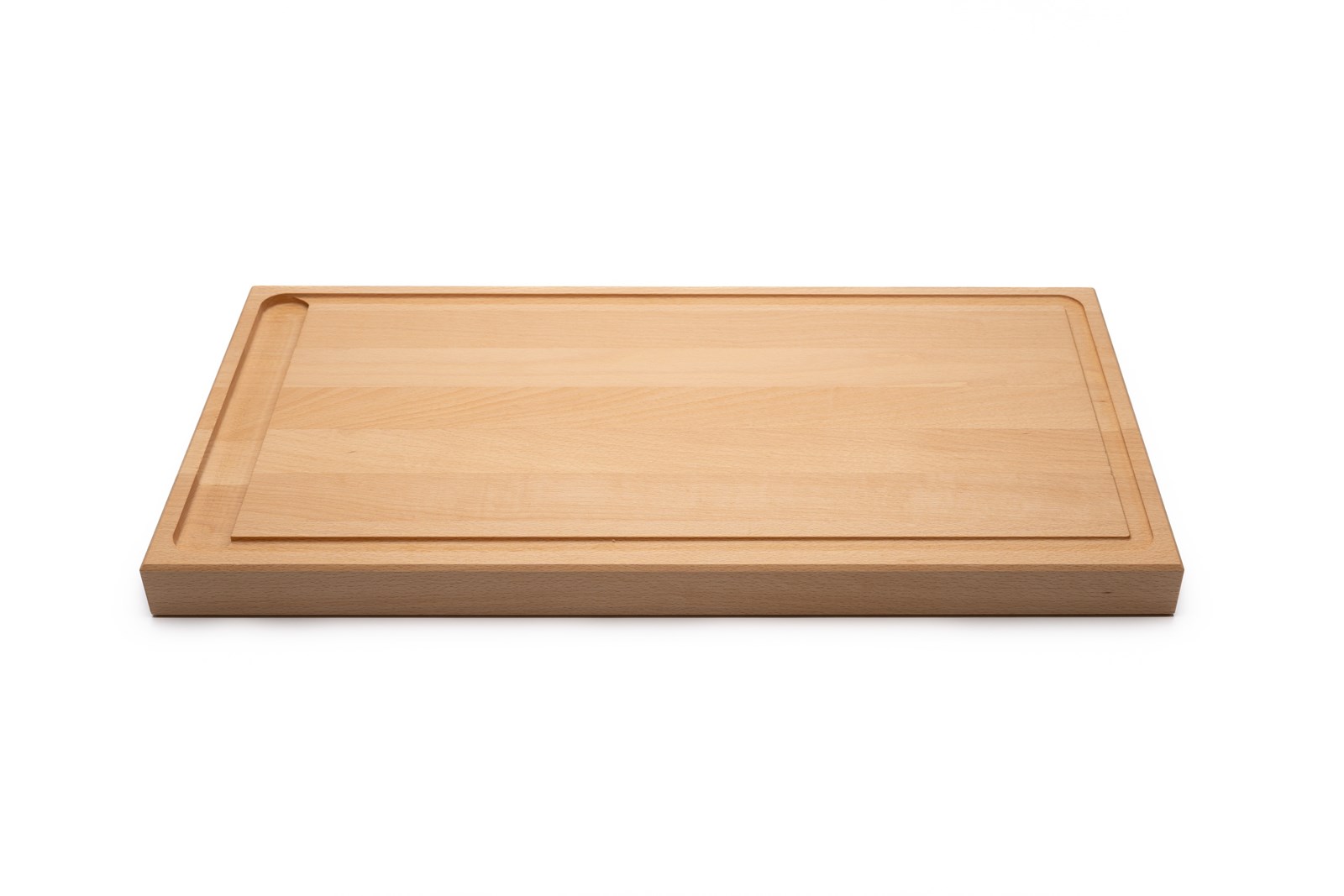 Skærebræt med rille og kar på 60 × 30 cm fremstillet af massivt, tykt, ovntørret og stavlimet træ. Konstruktionen giver et robust og formstabilt skærebræt med god vægt og stabilitet på bordet. Overfladen er behandlet med linolie, som beskytter træet og giver en slidstærk, funktionel finish.