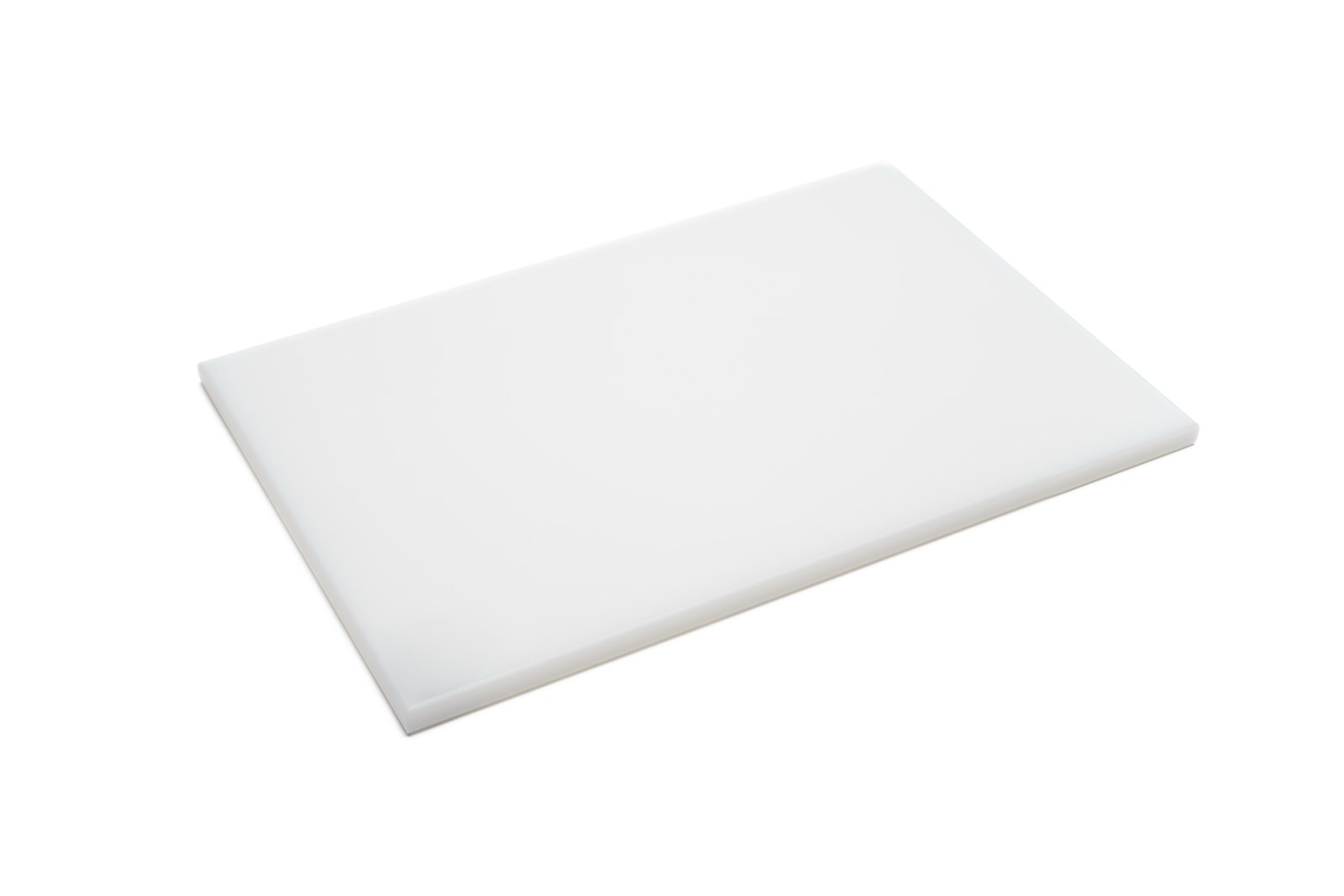 Skærebræt på 30 × 20 cm i hvid, fødevaregodkendt PE-plast (polyethylen), 1 cm tykt og uden fødder. Størrelsen giver en god balance mellem arbejdsflade og håndterbarhed og egner sig til daglig brug. Den lyse overflade giver høj kontrast og gør det let at vurdere renhed under klargøring.