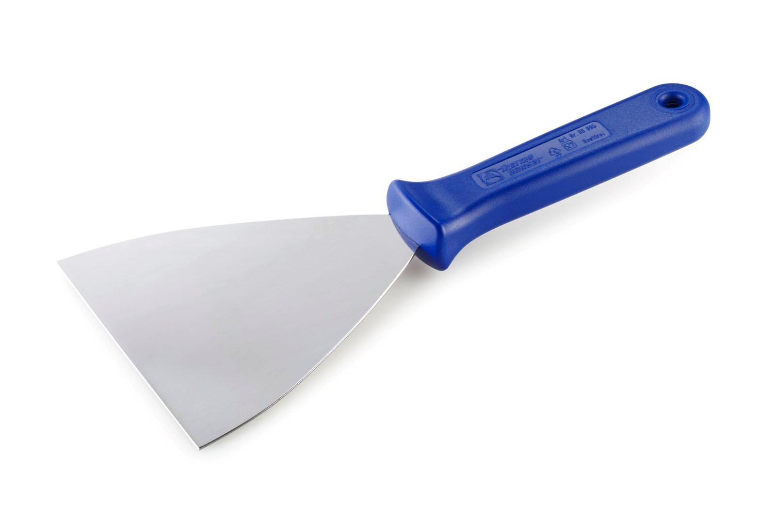 Materiale og konstruktion: Fremstillet af rustfrit stål med håndtag i blå polypropylen. Håndtaget er udført med ophængshul til opbevaring.