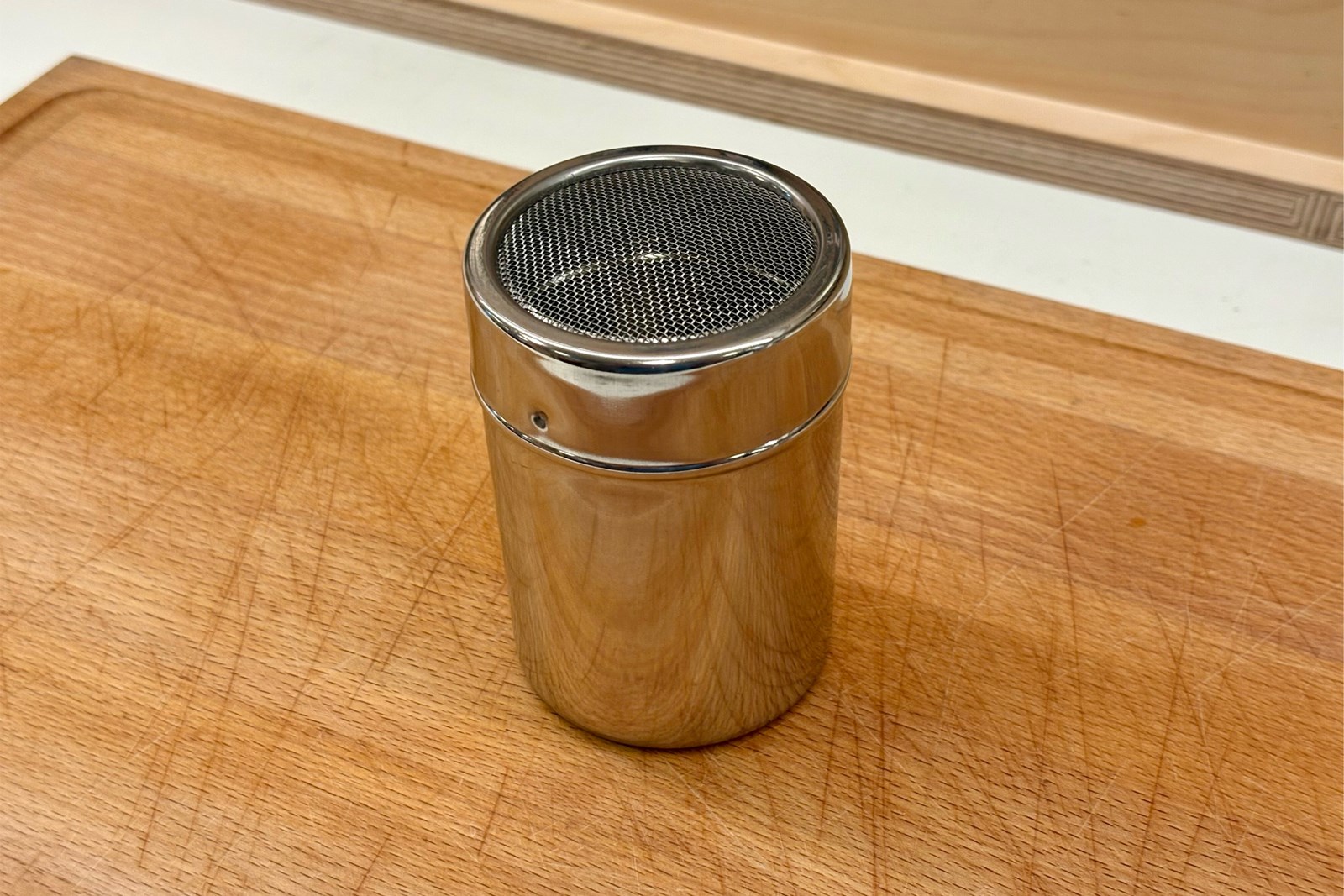 Strødåse i rustfrit stål med finmasket net. Egnet til meget fin dosering af tørre ingredienser i køkkenet eller ved bordet.