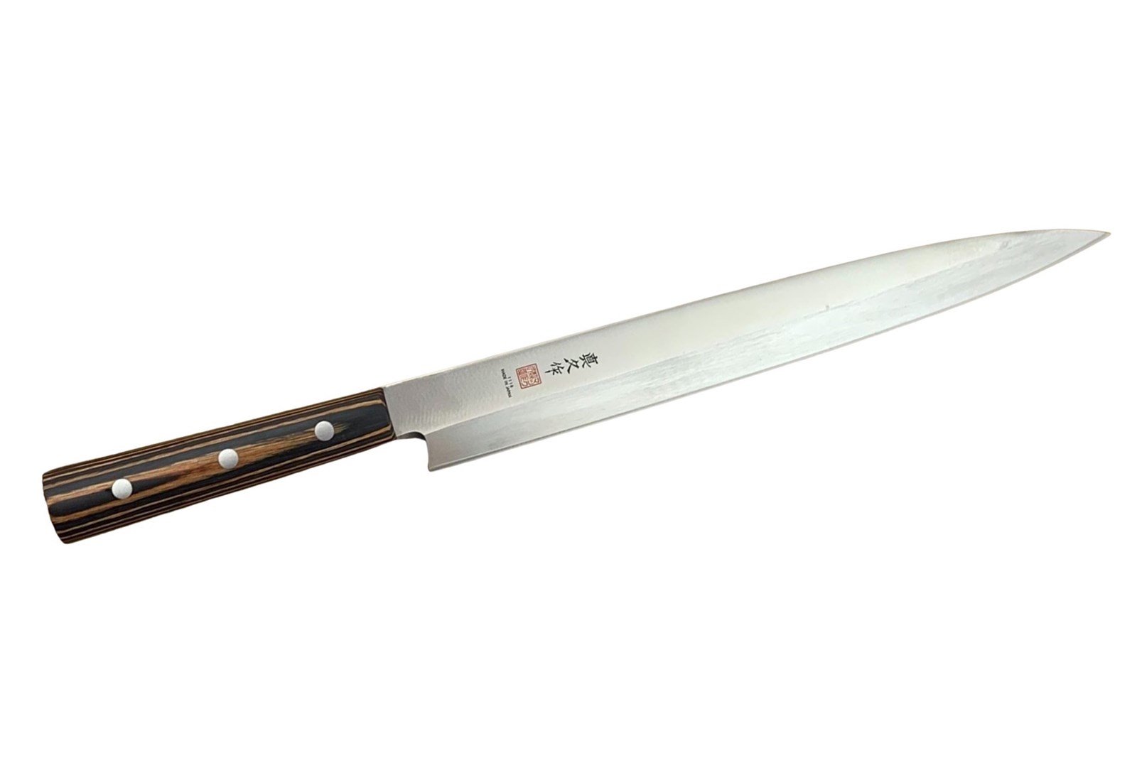 Sushikniv/sashimikniv i Yanagiba-stilart fra japanske MAC, med 29 cm langt knivblad af rustfrit stål og skæfte af sort pakkatræ.