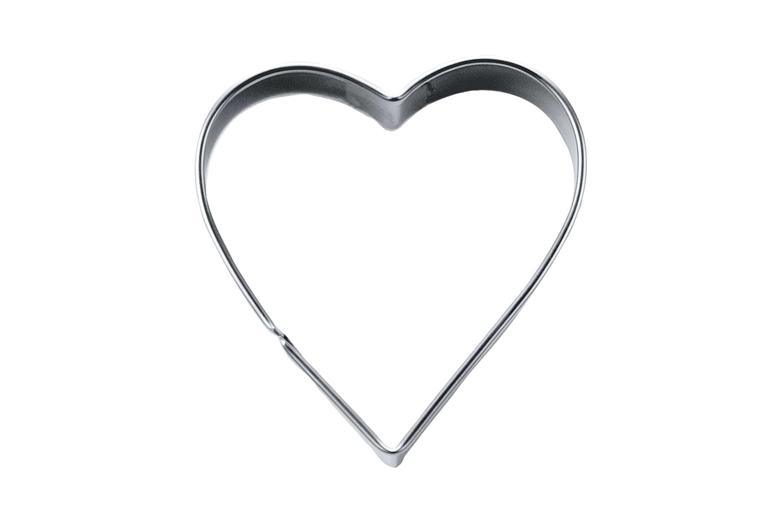 Hjerteformet udstikker i rustfrit stål, 12,5 × 11 cm. Længden måles tværs over hjertet, mens bredden måles fra top til bund.