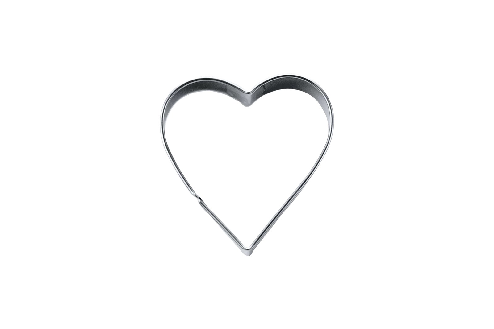 Hjerteformet udstikker i rustfrit stål, 10,5 × 8,5 cm. Længden måles tværs over hjertet, mens bredden måles fra top til bund.