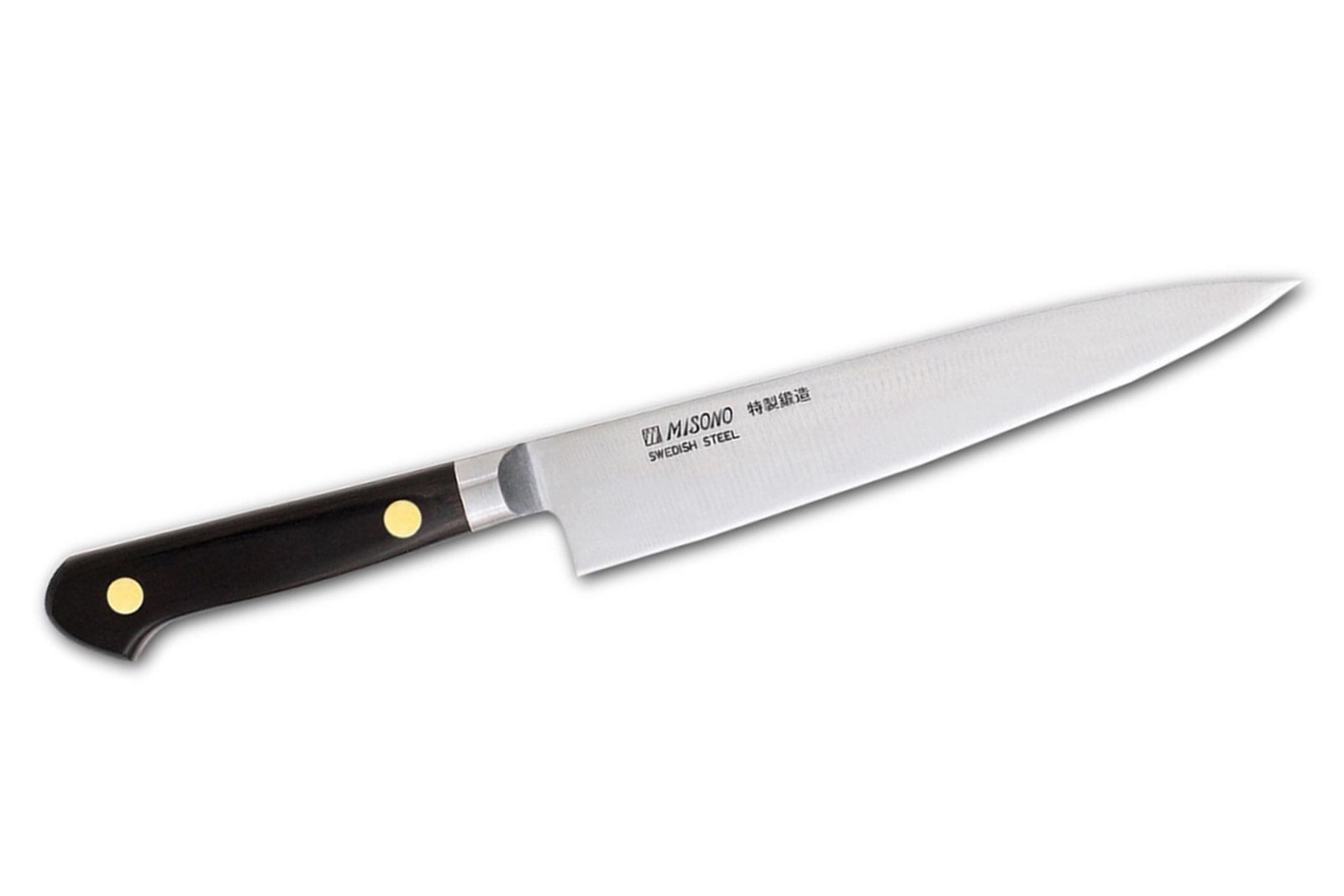 Urtekniv/grøntkniv fra japanske Misono i Petty-stil med knivblad på 15 cm af svensk karbonstål (kulstofstål) og skæfte i sort komposittræ.