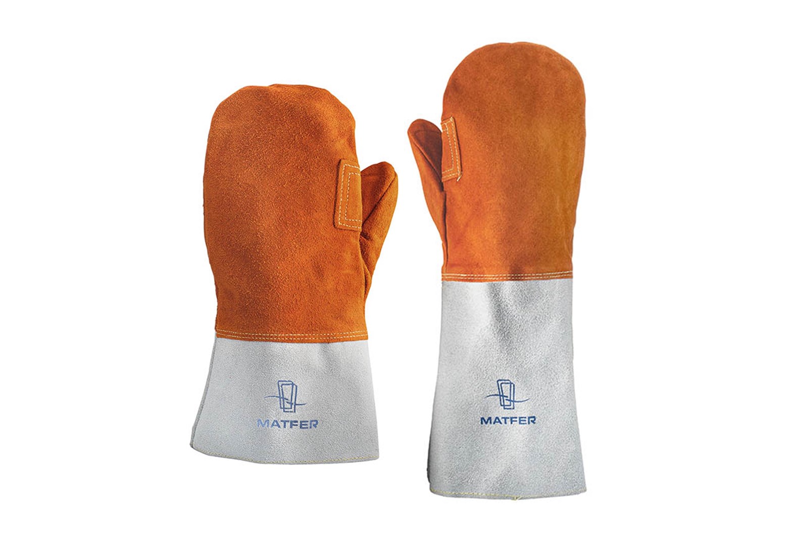 Materiale og konstruktion: Ruskind (spaltlæder) i brun-orange og lysegrå nuancer, foret med uld. Syet med Kevlar-tråd og med varmeforstærkning ved tommelfingeren.