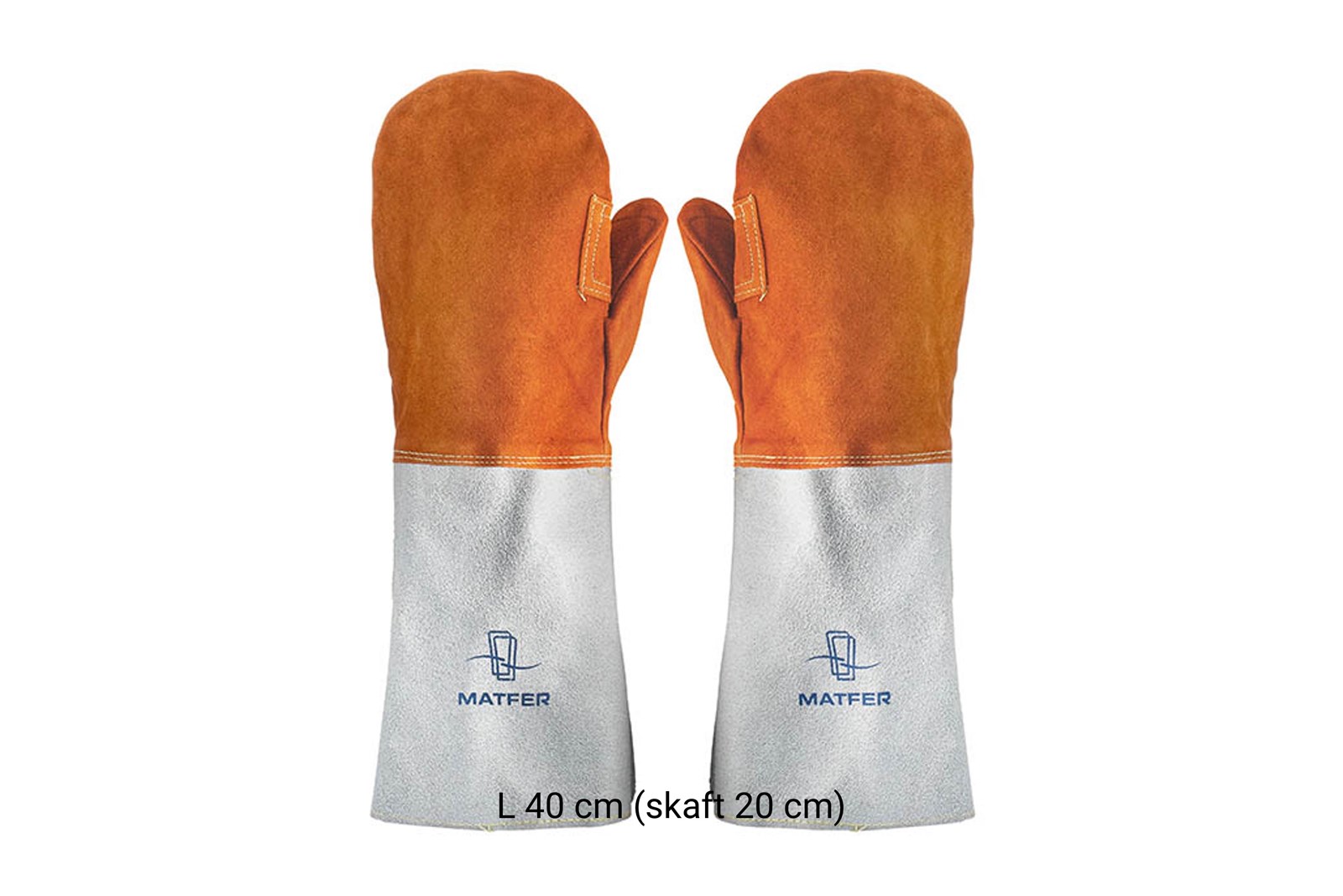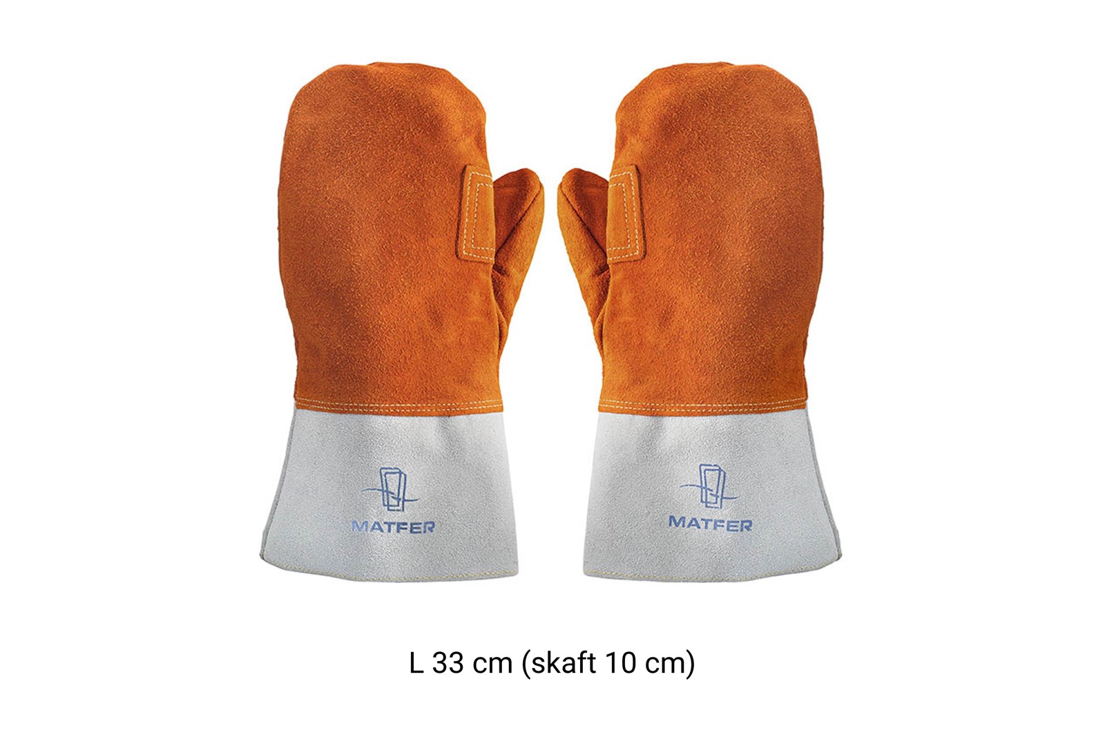 Varmeluffer i kraftigt brun-orange og lysegråt ruskind med uldfor. Syet med Kevlar-tråd og med varmeforstærkning ved tommelfingeren. Fås i to længder: 33 cm (skaft 10 cm) og 40 cm (skaft 20 cm).